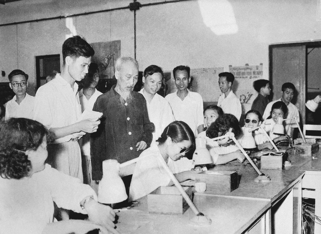 1964年4月28日,胡志明主席视察河内黎明灯泡-热水瓶工厂。