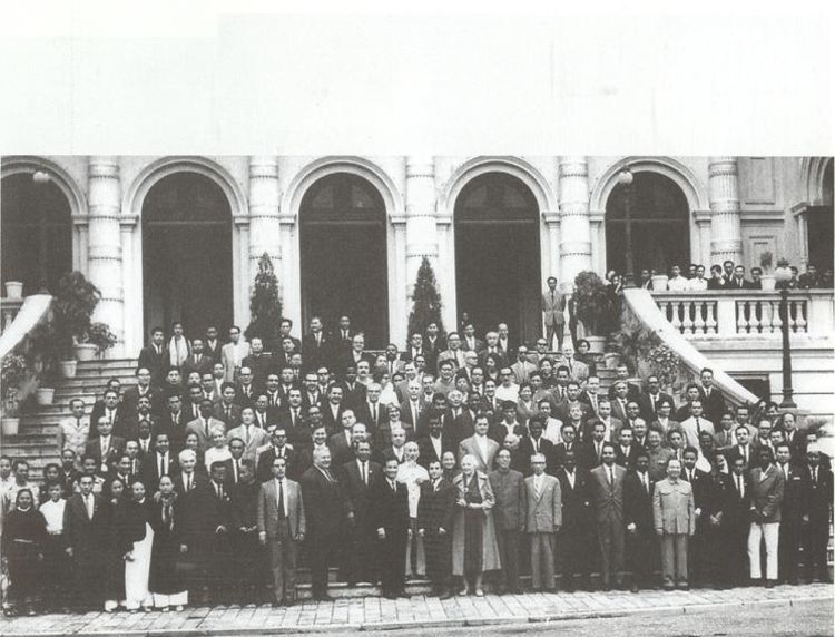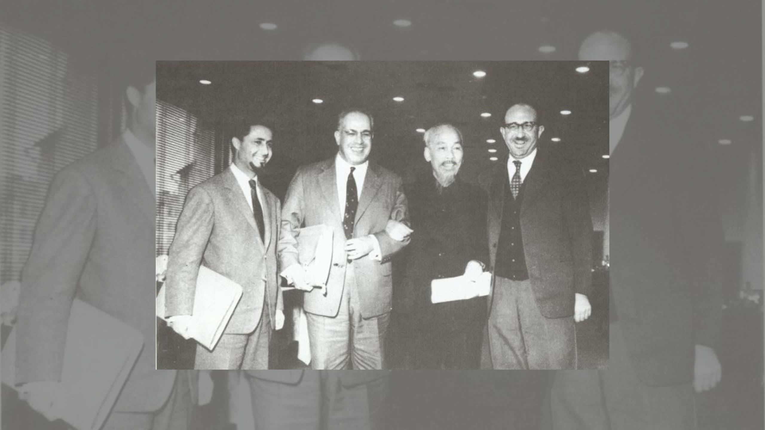 Chủ tịch Hồ Chí Minh chụp ảnh lưu niệm cùng các đại biểu tham dự Hội nghị quốc tế đoàn kết với nhân dân Việt Nam chống đế quốc Mỹ: Bảo vệ hòa bình tại Phủ Chủ tịch, tháng 11/1964. Ảnh: Khu di tích Hồ Chí Minh tại Phủ Chủ tịch