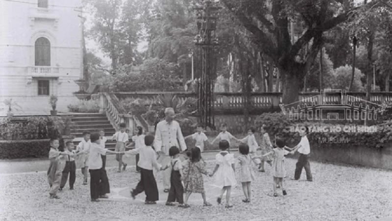 Bác Hồ với các cháu thiếu nhi tại Phủ Chủ tịch. (Ảnh tư liệu Bảo tàng Hồ Chí Minh)
