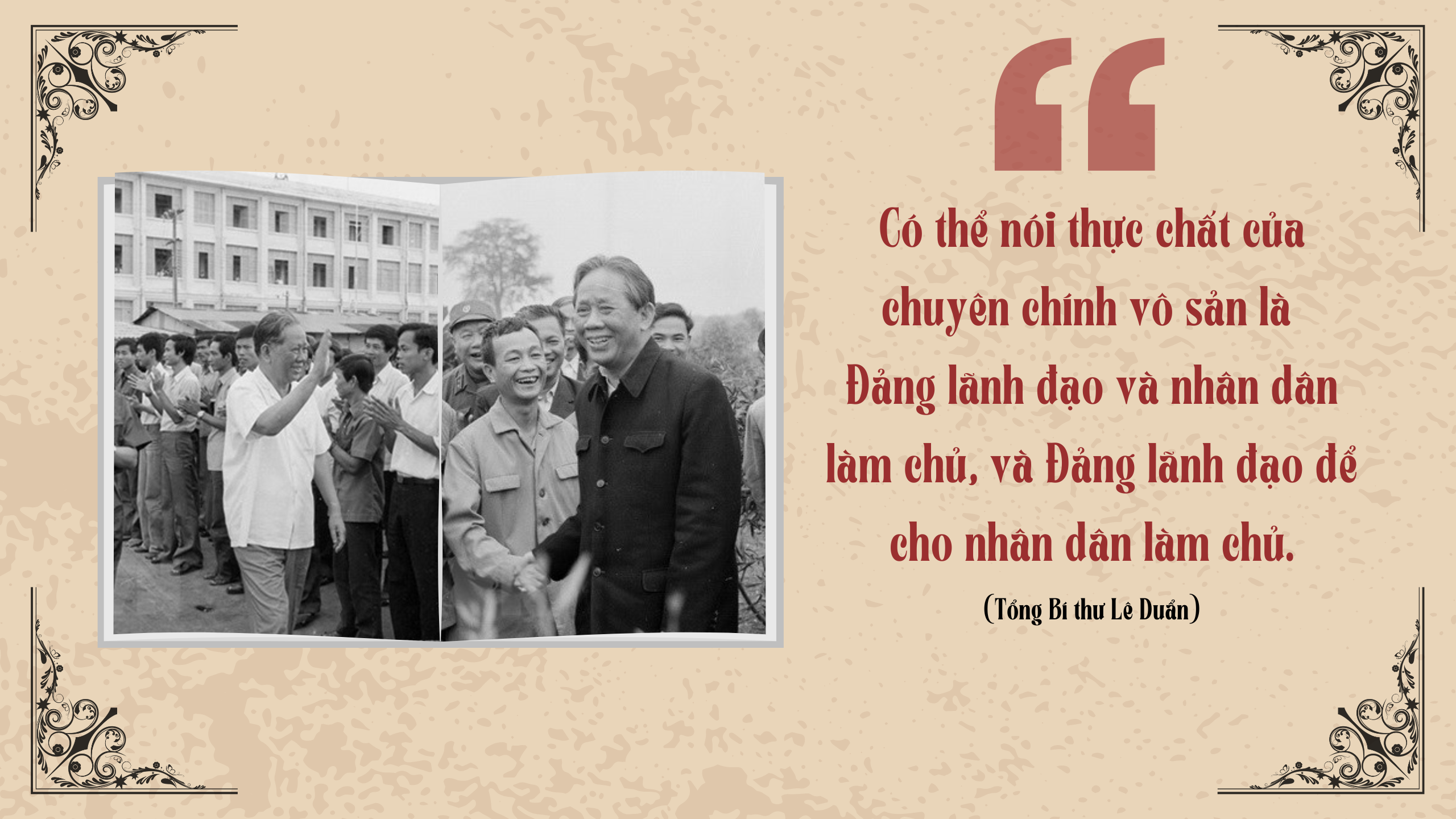 Đồng chí Lê Duẩn khẳng định: “Có thể nói thực chất của chuyên chính vô sản là Đảng lãnh đạo và nhân dân làm chủ, và Đảng lãnh đạo để cho nhân dân làm chủ”. Đồng chí cho rằng, xây dựng chế độ làm chủ tập thể là xây dựng xã hội nước ta thành một xã hội, trong đó, người làm chủ là cộng đồng xã hội có tổ chức, là xây dựng một hệ thống hoàn chỉnh các quan hệ xã hội thể hiện ngày càng đầy đủ sự làm chủ của nhân dân về chính trị, kinh tế, văn hóa, xã hội; “làm chủ xã hội, làm chủ thiên nhiên, làm chủ bản thân” như Ph.Ăng-ghen nói; làm chủ trong phạm vi cả nước, trong mỗi địa phương, mỗi cơ sở; là kết hợp hài hòa sự làm chủ của cộng đồng với quyền tự do của từng cá nhân, “hai cái đó thống nhất với nhau, không hề có mâu thuẫn”.