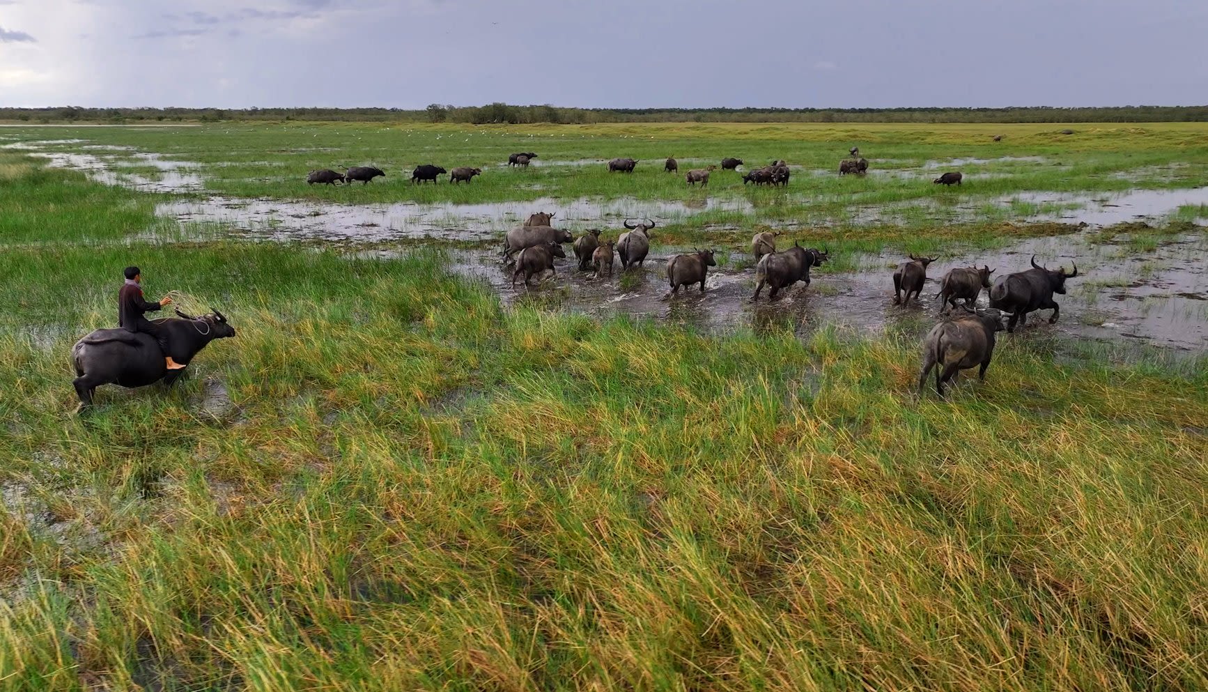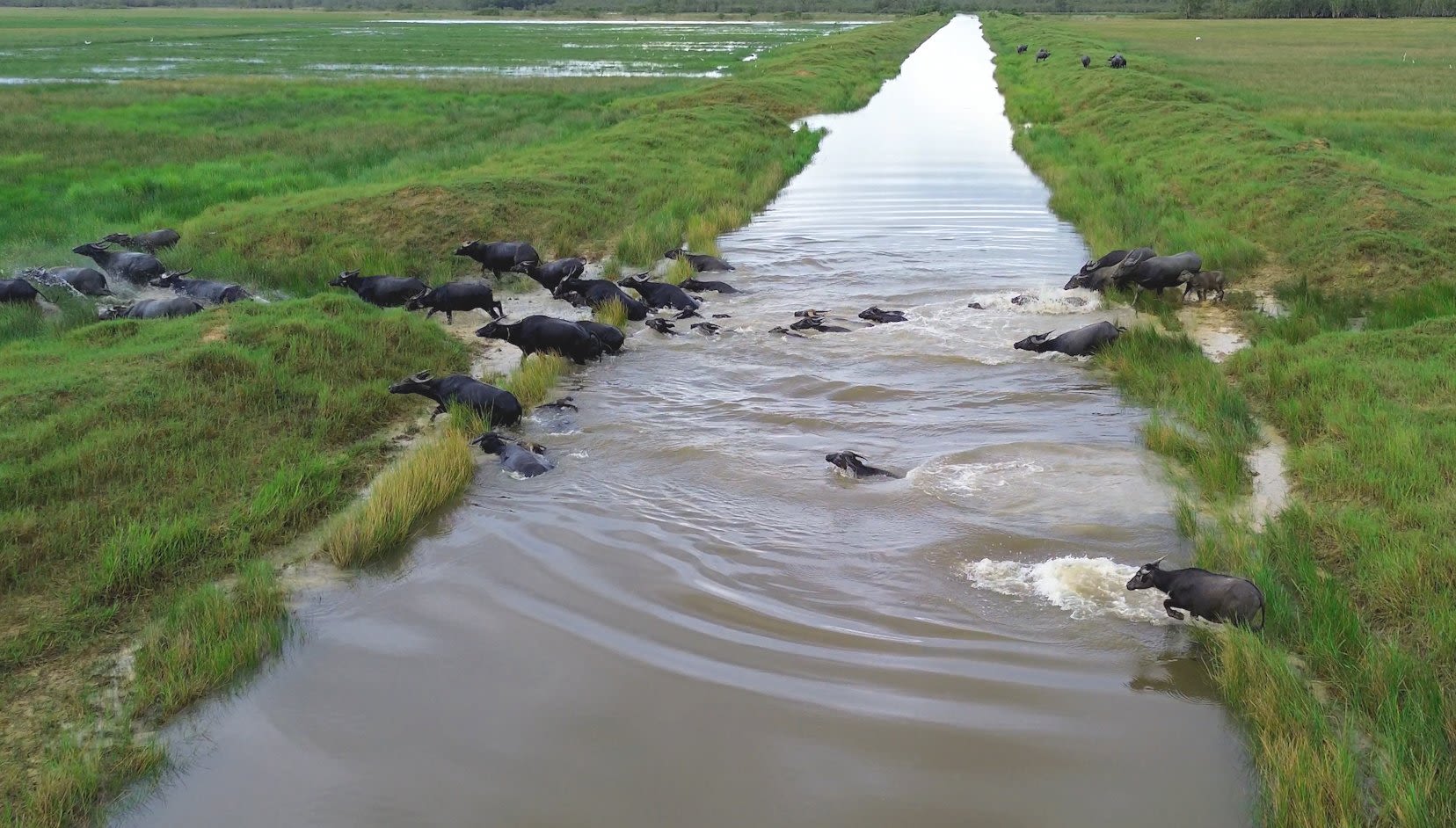 Xế chiều, trời đang nắng bỗng kéo mây đen mù mịt rồi mưa to ập tới bất ngờ. Có chủ trâu nói qua điện thoại cho Lắm, nhờ bắt mấy con trâu đi lạc giữa đồng về chuồng để chữa bệnh. Vì ngày hôm trước trong lúc đi len trâu trên đồng nước, Lắm phát hiện có xác một trâu nghé mới sinh đã chết cặp bờ kênh. Cạnh đó, trâu mẹ có dấu hiệu không tốt về sức khỏe nên báo cho chủ nuôi biết.