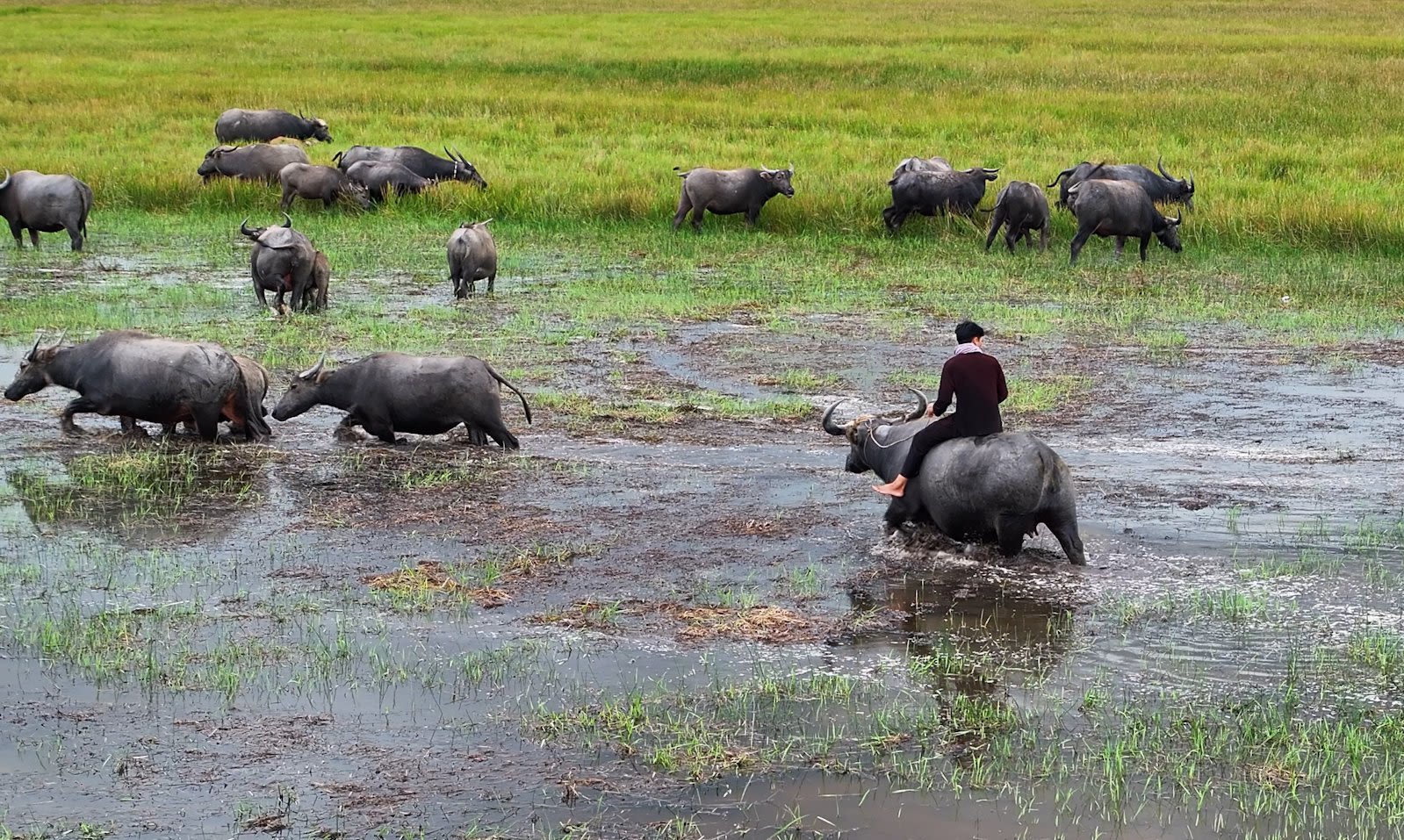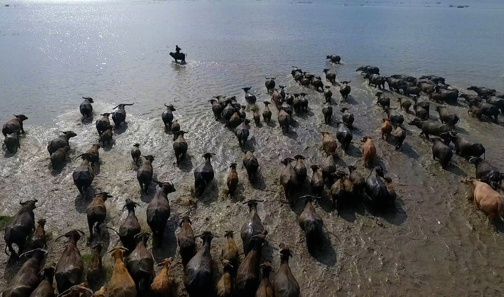 Mặt trời ngoi lên khỏi ngọn tràm cũng là lúc đàn trâu từ khắp nơi của nhà dân đã tập trung ra đồng đi ăn cỏ.