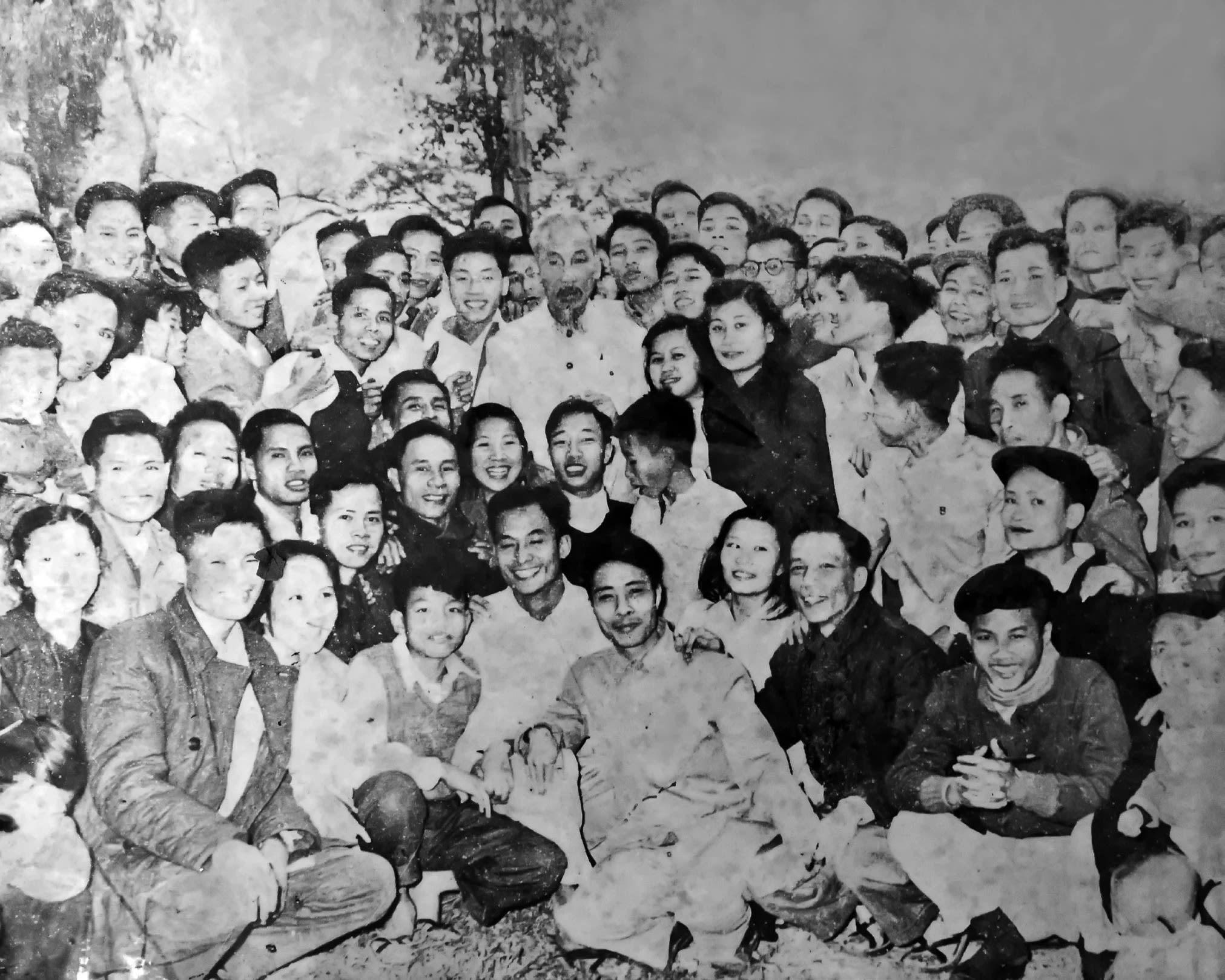 Bác Hồ với cán bộ, phóng viên Báo Nhân Dân, năm 1957. Ảnh: TTXVN