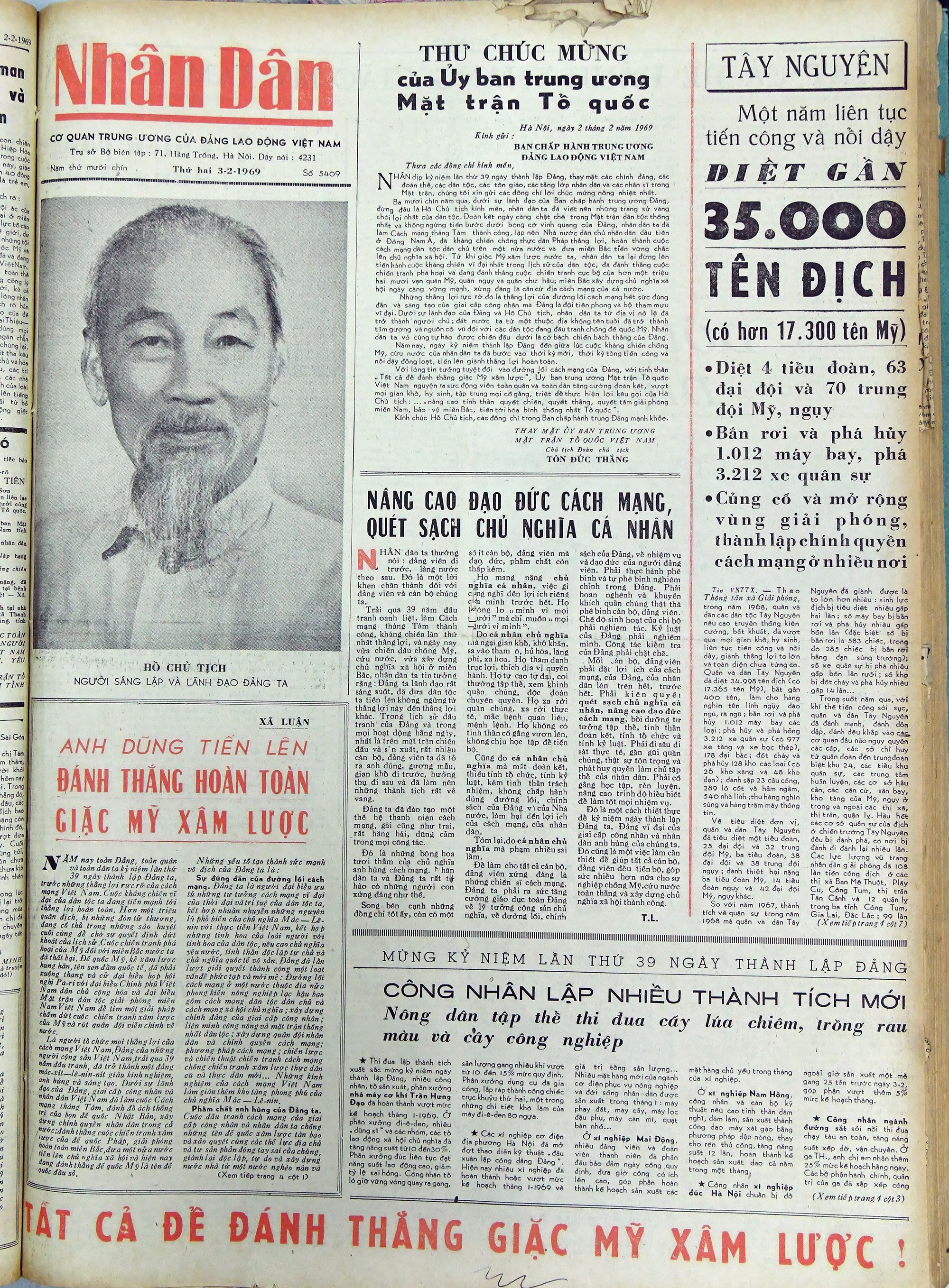 Bài viết Nâng cao đạo đức cách mạng, quét sạch chủ nghĩa cá nhân của Bác đăng trên Báo Nhân Dân, số 5409, ngày 3/2/1969.