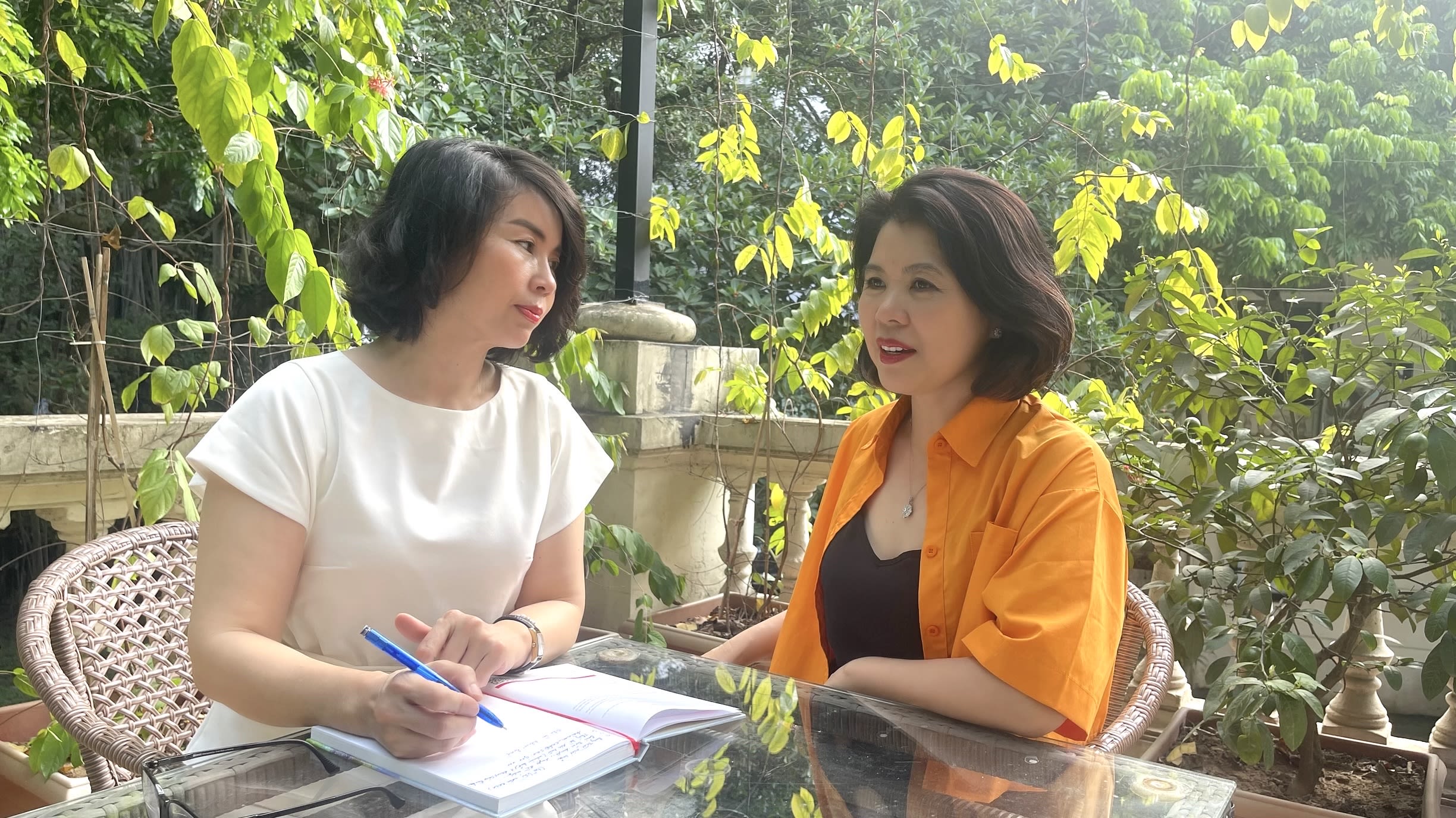 Nhà văn Như Bình trao đổi với nhà báo Phan Thanh Phong