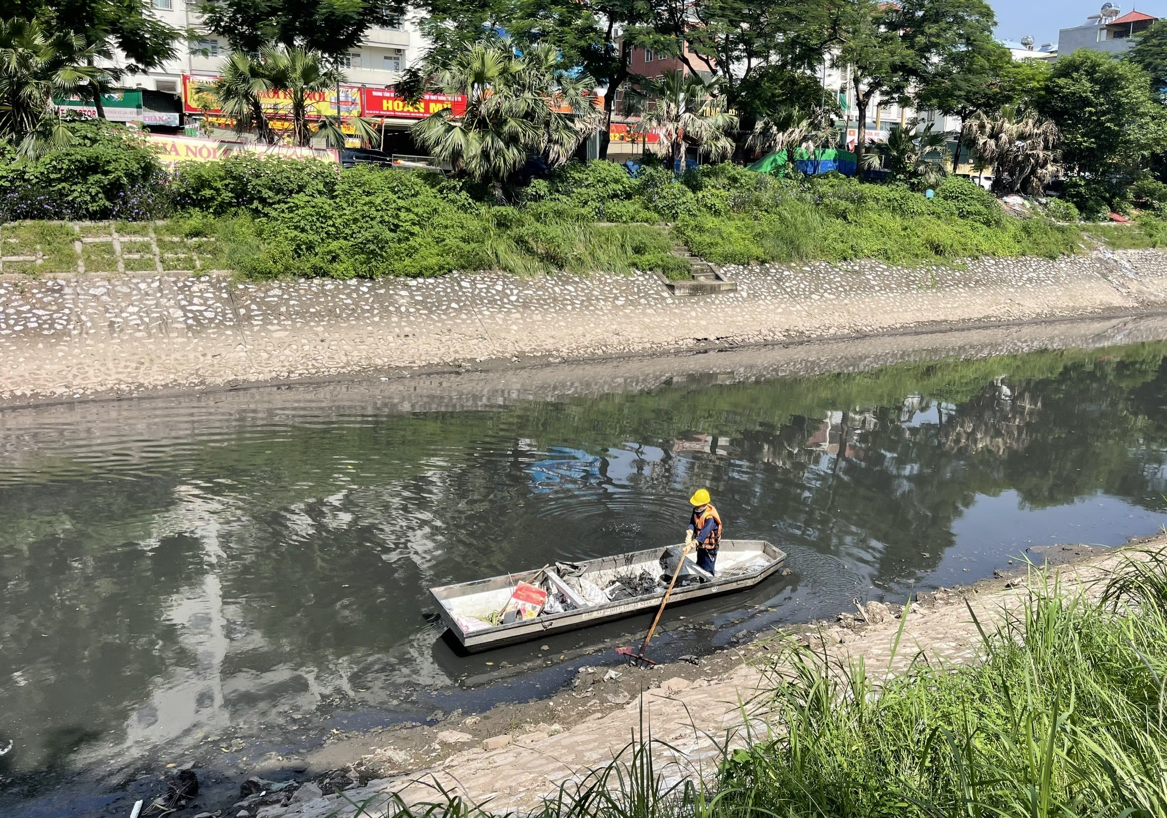 Công nhân Công ty Thoát nước Hà Nội thường xuyên thu gom rác thải trên sông
