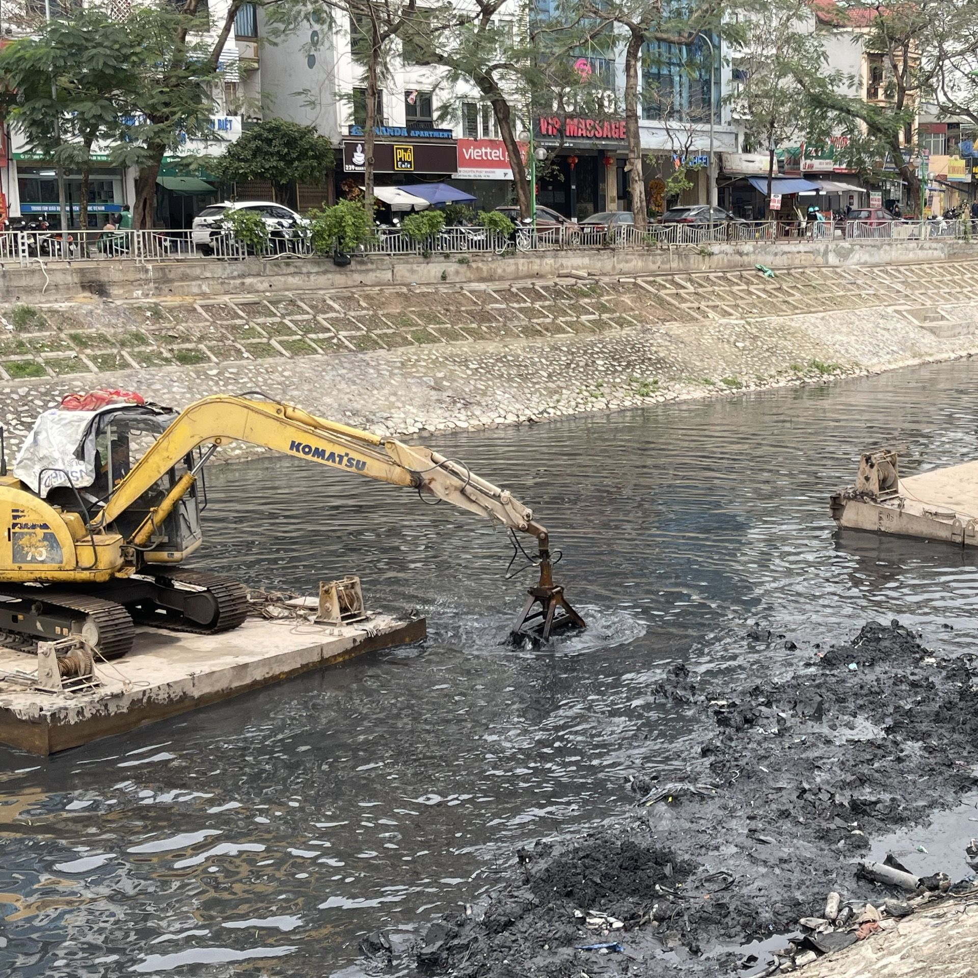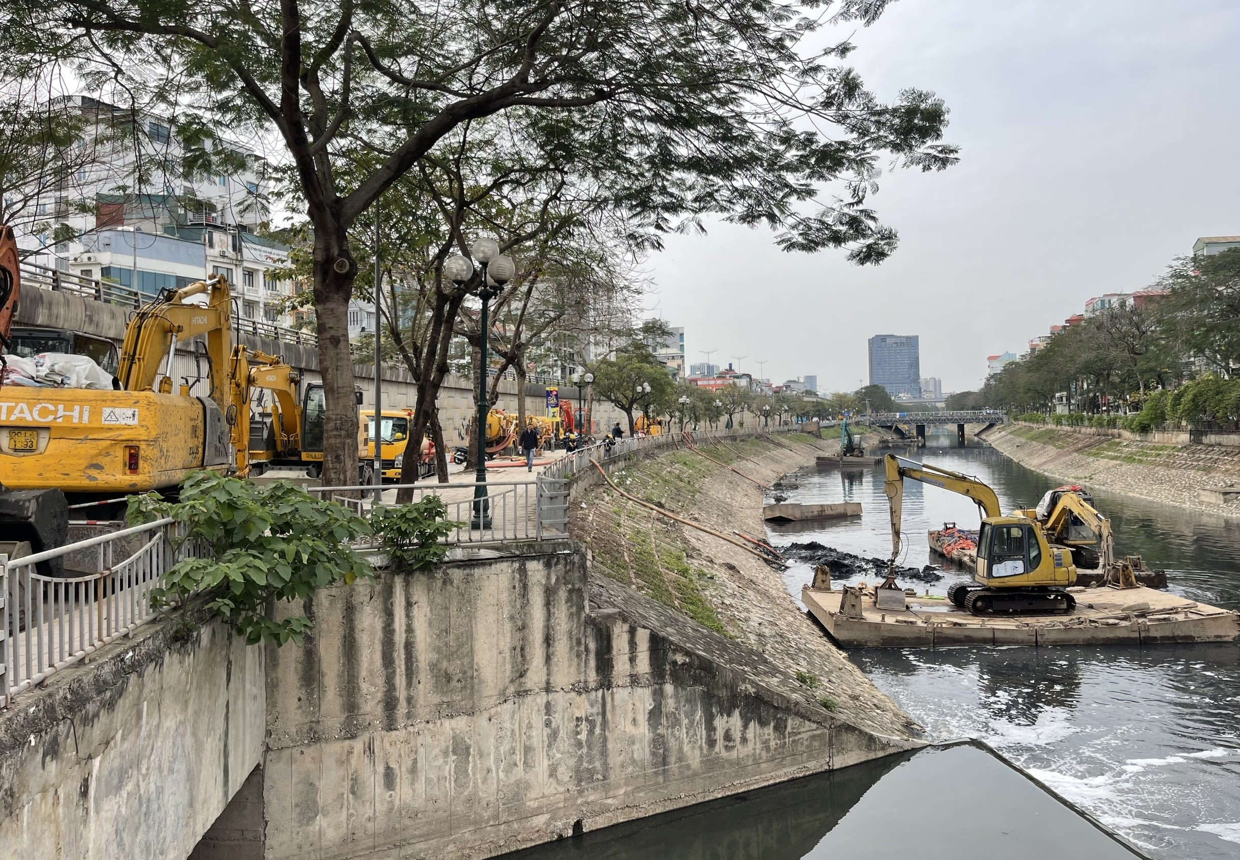 Công ty Thoát nước Hà Nội huy động nhiều phương tiện cơ giới tham gia nạo vét, vận chuyển bùn thải sông Tô Lịch.