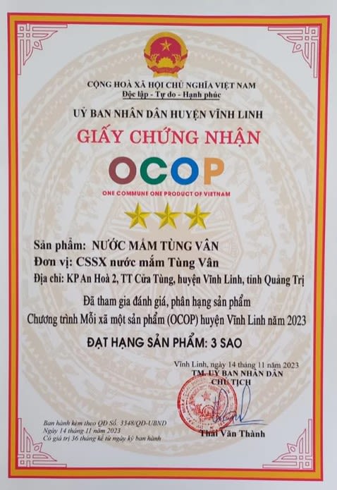 Năm 2023, sản phẩm nước mắm Tùng Vân đã vinh dự đạt OCOP 3 sao của tỉnh Quảng Trị. Đam mê của người con miền biển với sản vật, nguồn nguyên liệu trên chính mảnh đất quê hương đã thu được trái ngọt. Anh Tùng cho biết, dù chỉ mới tham gia OCOP được gần 1 năm, nhưng nhờ chứng nhận OCOP như một bảo chứng thương hiệu, sản phẩm nước mắm Tùng Vân đã tiếp cận được thêm nhiều khách hàng, doanh số cải thiện đáng kể.