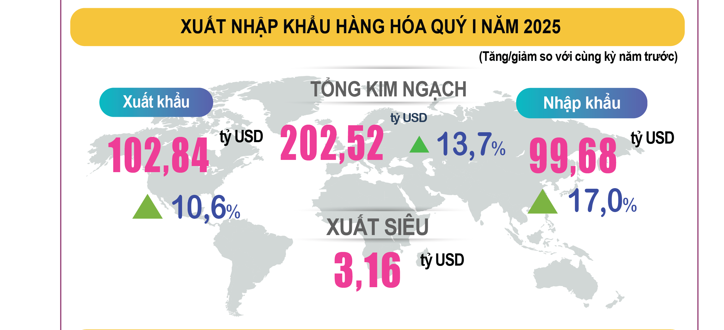 Quý I/2025, Việt Nam tiếp tục xuất siêu hàng hóa 3,16 tỷ USD. Các sản phẩm xuất khẩu tăng mạnh như: mặt hàng điện tử máy tính và linh kiện, sản phẩm từ sắt thép, cà phê, cao su, hồ tiêu, hàng dệt may.