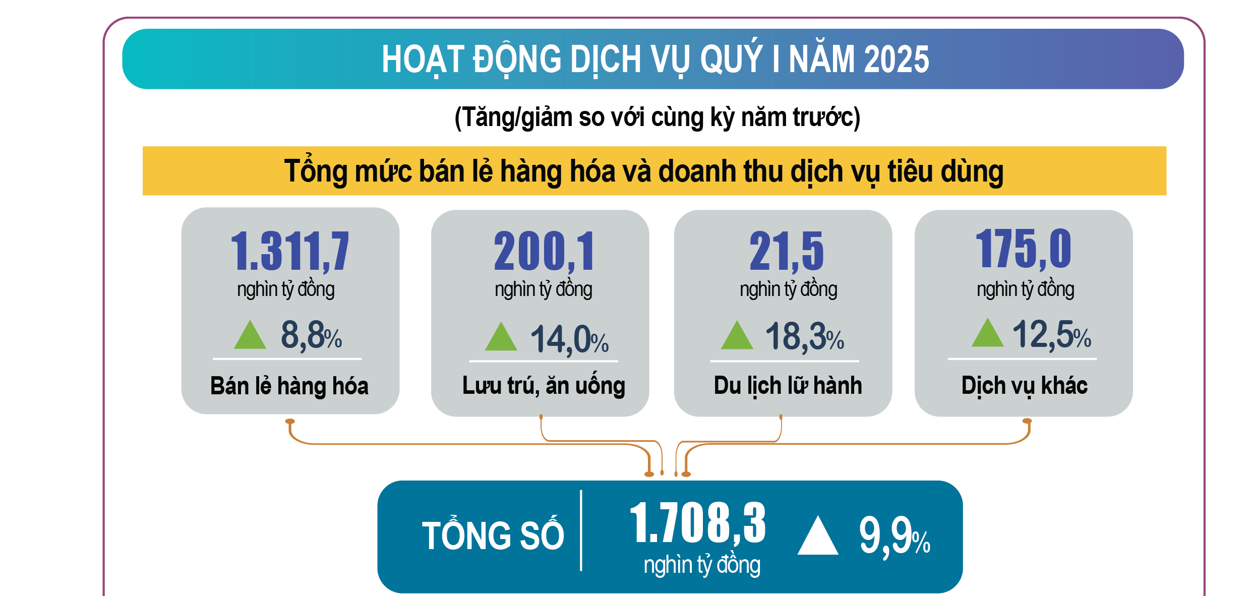 Tiêu dùng trong nước tăng khá đạt 7,45%. Mặc dù sức mua nội địa chưa hồi phục hoàn toàn nhưng quý I năm nay có Tết nguyên đán và các lễ hội xuân nên nhu cầu nội địa cũng được bù đắp từ du lịch của người dân và du khách quốc tế đến Việt Nam. Tổng mức bán lẻ hàng hóa và doanh thu dịch vụ tiêu dùng quy I/2025 ước đạt 1.708,3 nghìn tỷ đồng, tăng 9,9% so với cùng kỳ năm trước. Số lượng khách quốc tế đến Việt Nam trong 3 tháng đầu năm 2025 đạt hơn 6 triệu lượt khách, là mức cao nhất của một quý từ trước đến nay và tăng 29,6% so với cùng kỳ năm trước.
