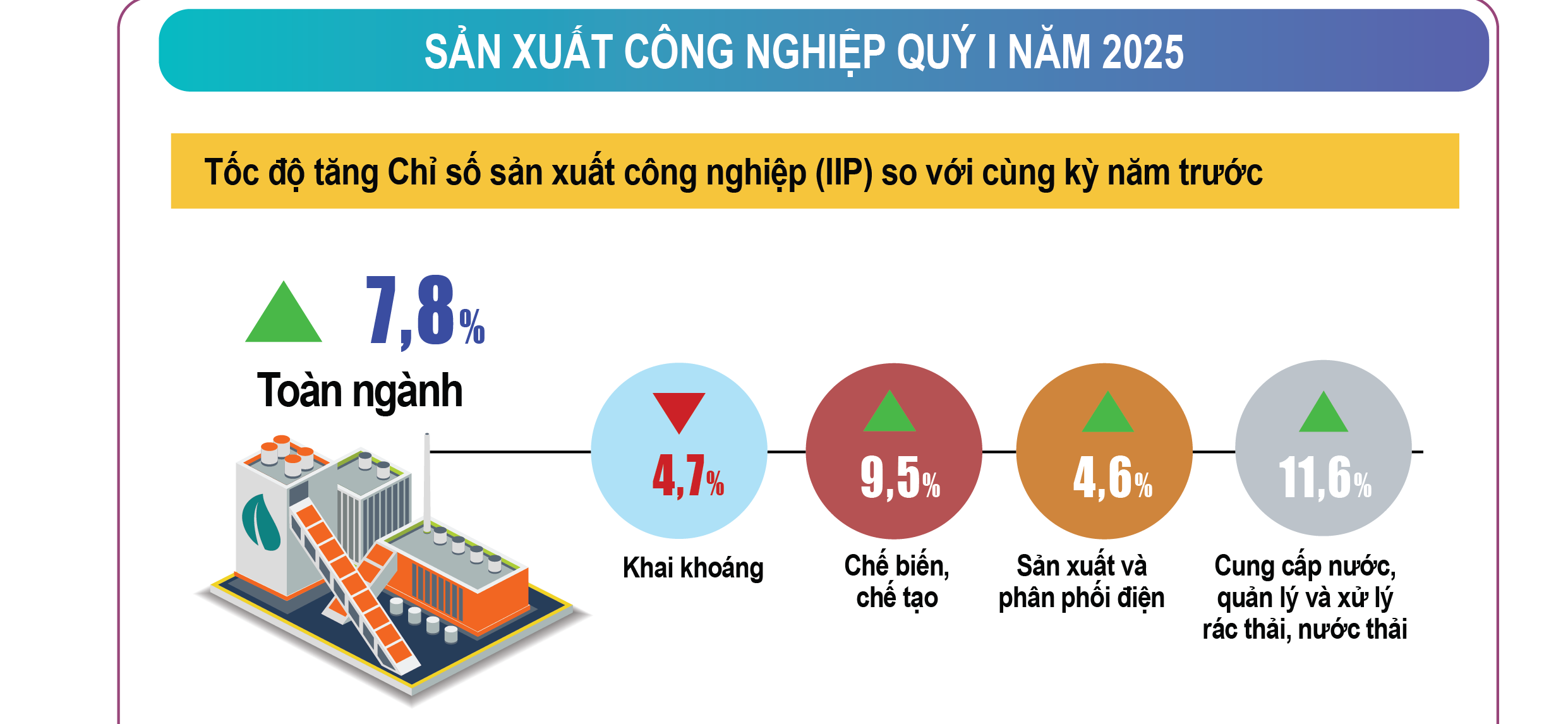 Tiếp đà tăng trưởng từ năm 2024, sản xuất công nghiệp quý I năm 2025 tăng trưởng khởi sắc. Chỉ số sản xuất công nghiệp quý I/2025 ước tăng 7,8% so với cùng kỳ năm trước (cùng kỳ năm trước tăng 5,9%).