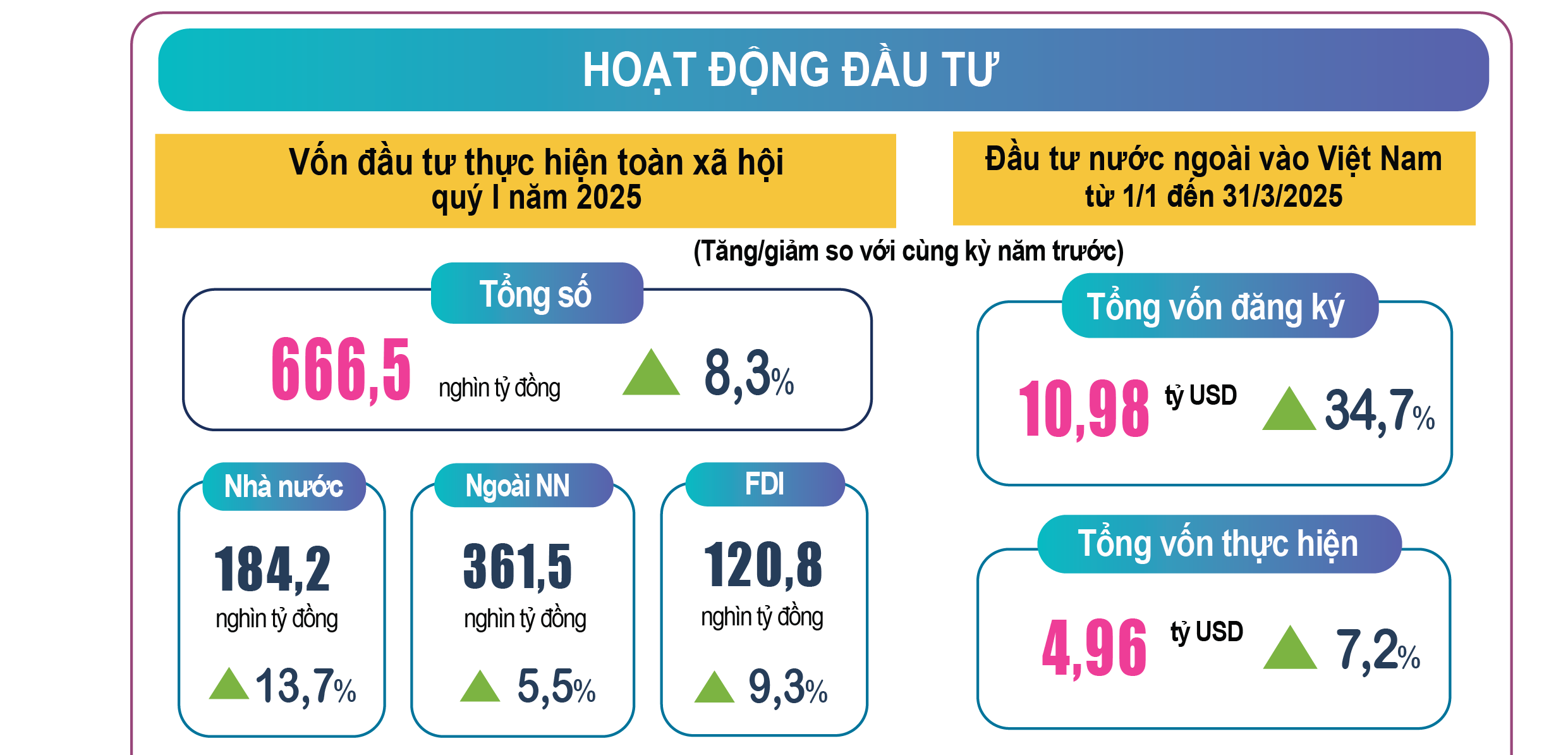 Vốn đầu tư thực hiện toàn xã hội quý I/2025 theo giá hiện hành ước đạt 666,5 nghìn tỷ, tăng 8,3% so với cùng kỳ năm 2024, trong đó khu vực nhà nước tăng cao nhất đạt 13,7%; khu vực ngoài nhà nước tăng 5,5%; khu vực đầu tư trực tiếp nước ngoài tăng 9,3%. Tích lũy tài sản được hỗ trợ lớn từ đầu tư công và FDI.