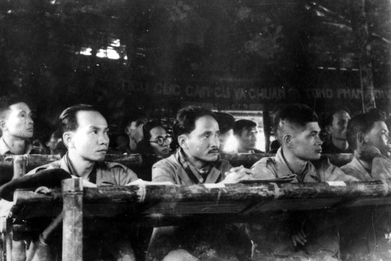 Hội nghị văn hóa lần thứ I ở chiến khu Việt Bắc, năm 1949 (Ngồi hàng đầu, từ trái sang phải: Trường Chinh, Hoàng Quốc Việt, Lê Văn Lương, Trần Huy Liệu). (Ảnh: Bảo tàng Lịch sử quốc gia)