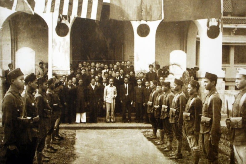 Chủ tịch Hồ Chí Minh dự Triển lãm "Những tài liệu lịch sử của Văn hóa Việt Nam" tại Bảo tàng Louis Finot (Nay là Bảo tàng Lịch sử quốc gia), ngày 9/2/1946. (Ảnh: Bảo tàng Lịch sử quốc gia)