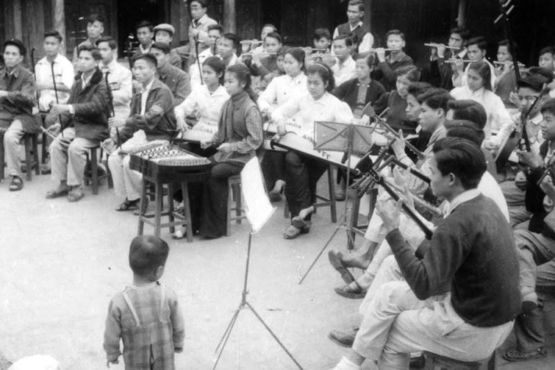 Các nhạc sĩ trong kháng chiến chống Pháp tập dượt biểu diễn. (Ảnh: Bảo tàng Lịch sử quốc gia)