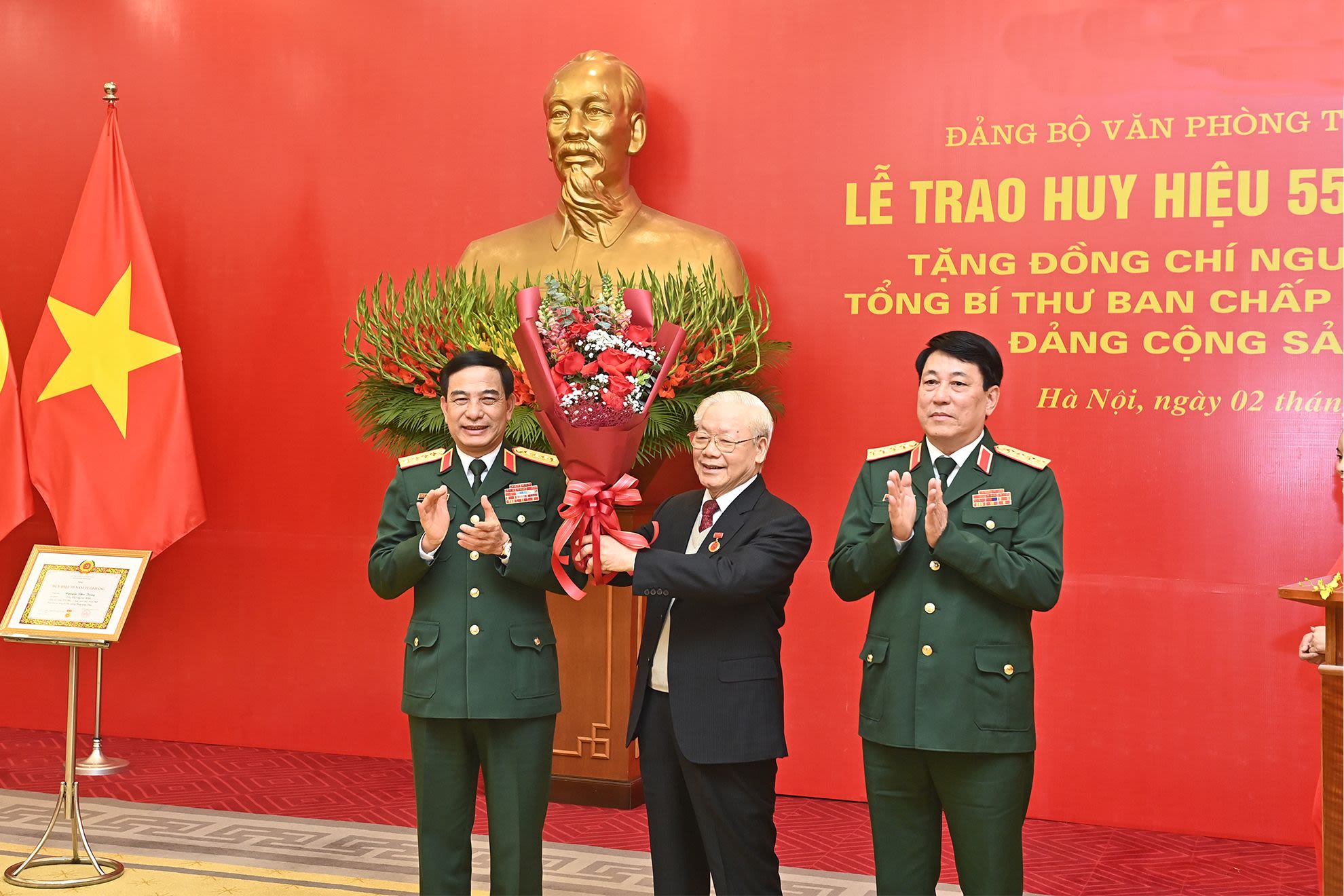 Đại tướng Phan Văn Giang và Đại tướng Lương Cường chúc mừng Tổng Bí thư Nguyễn Phú Trọng nhận Huy hiệu 55 năm tuổi Đảng (ngày 2/2/2023). Ảnh: ĐĂNG KHOA