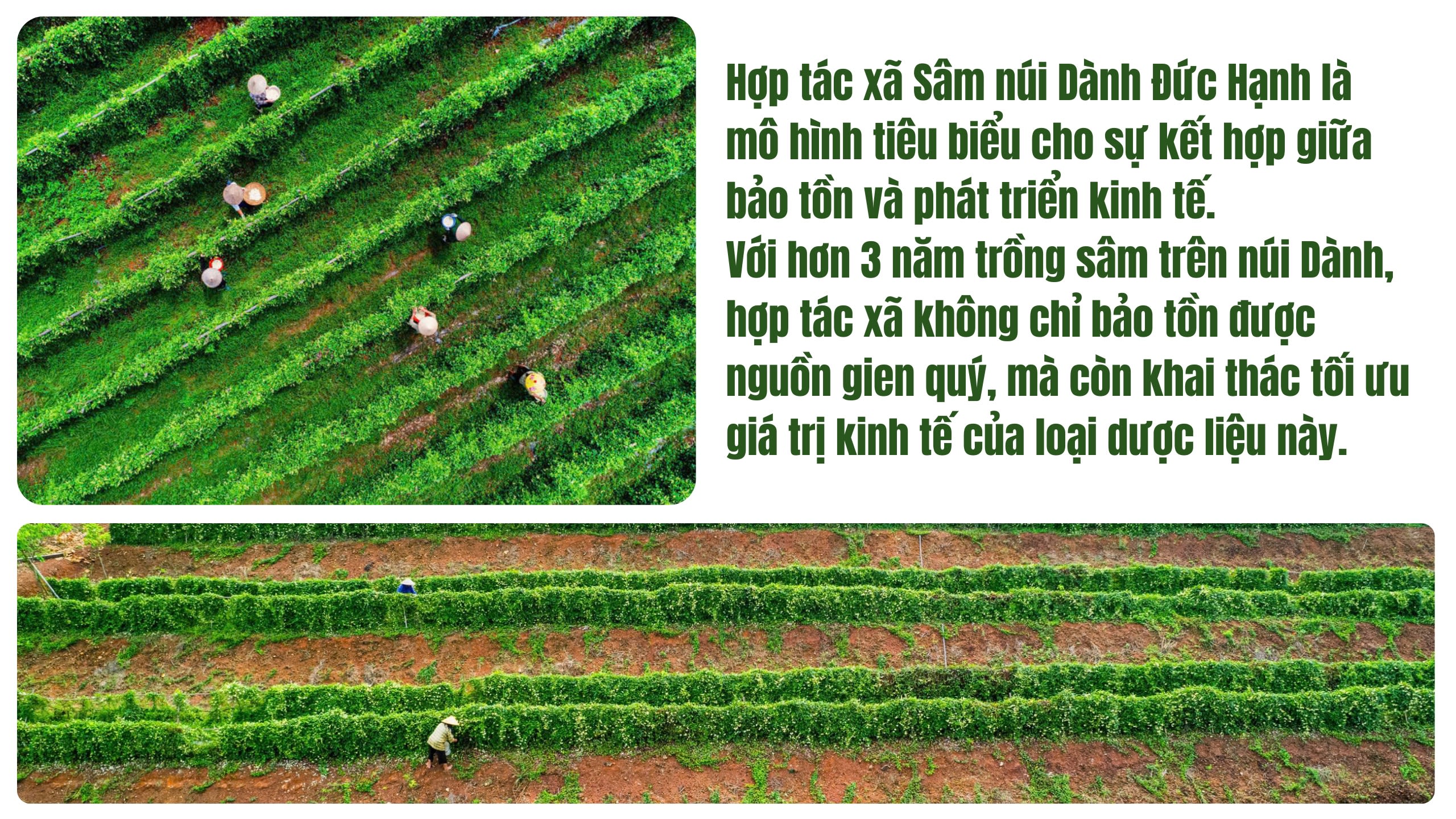 Hợp tác xã Sâm núi Dành Đức Hạnh là mô hình tiêu biểu cho sự kết hợp giữa bảo tồn và phát triển kinh tế. Với hơn 3 năm trồng sâm trên núi Dành, hợp tác xã không chỉ bảo tồn được nguồn gien quý, mà còn khai thác tối ưu giá trị kinh tế của loại dược liệu này.