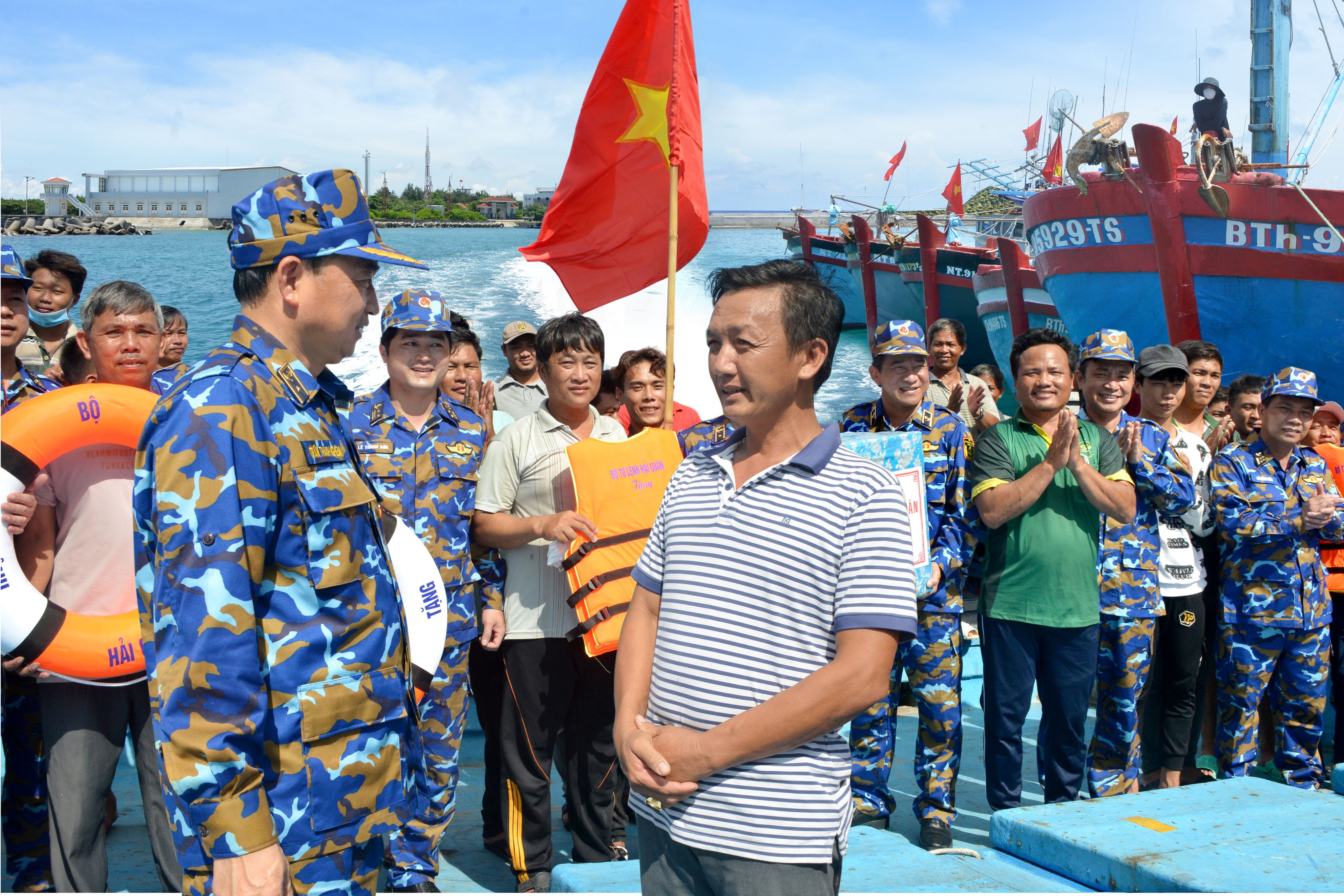 Tư lệnh Hải quân thăm, động viên, tặng cờ ngư dân Trường Sa, tháng 4/2022. (Ảnh: Trọng Thiết)