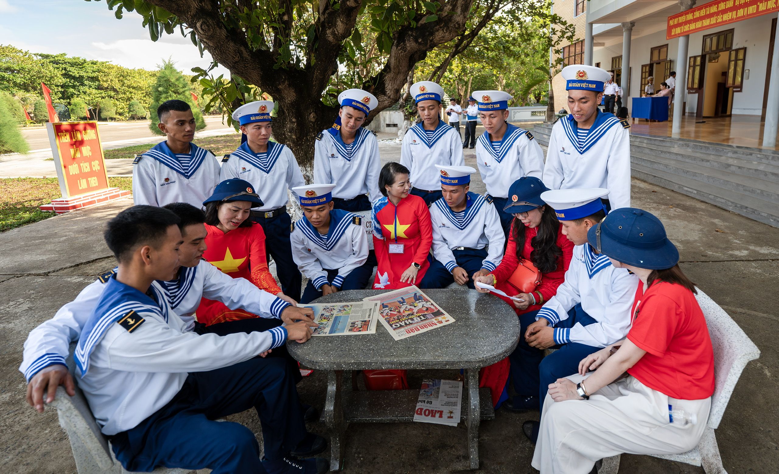 Các chiến sĩ Trường Sa quân quần đọc báo cùng đoàn công tác Tập đoàn Dầu khí Việt Nam. (Ảnh: YOU HOÀNG)