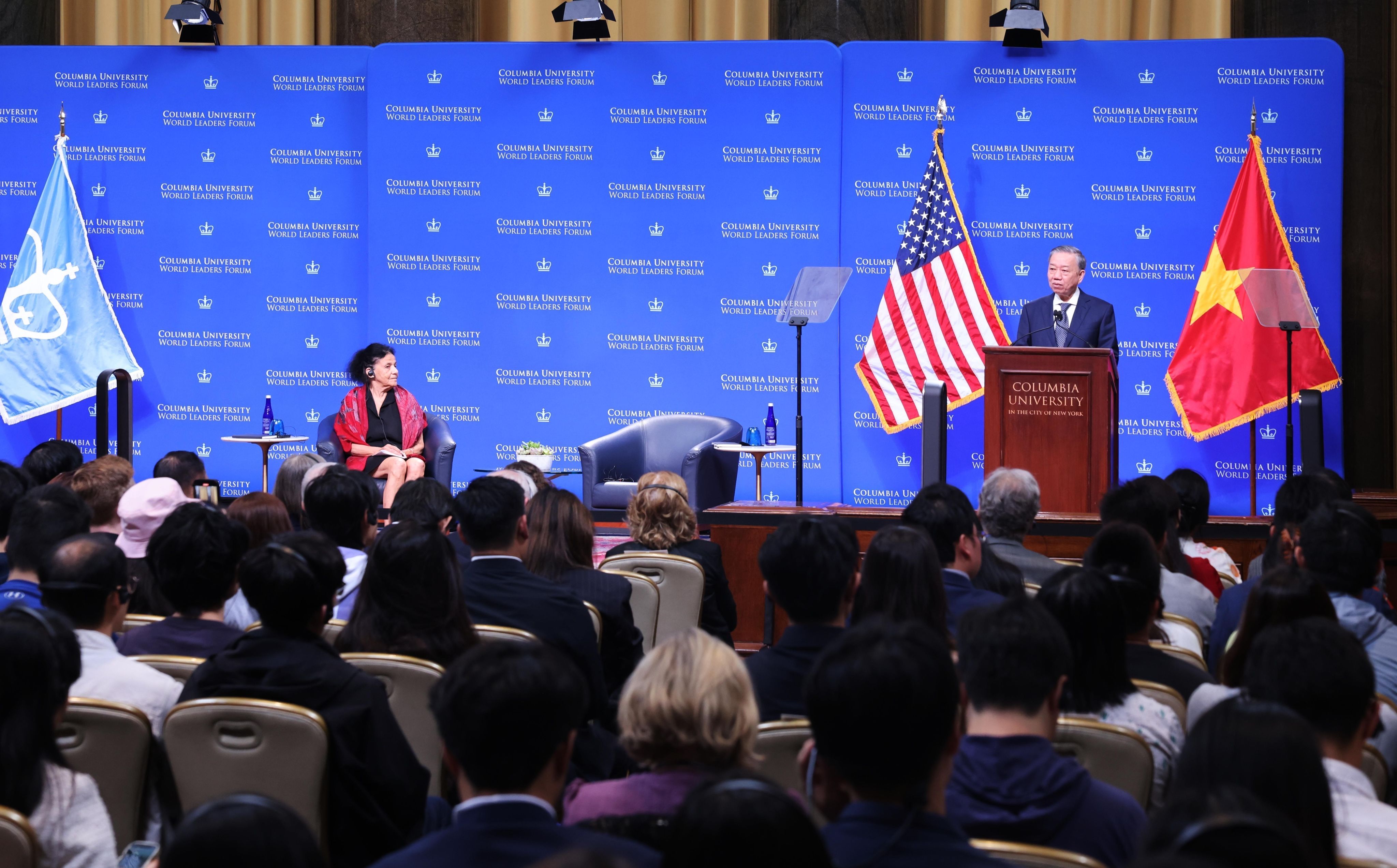 苏林总书记2024年9月23日在美国纽约哥伦比亚大学发表政策演讲。