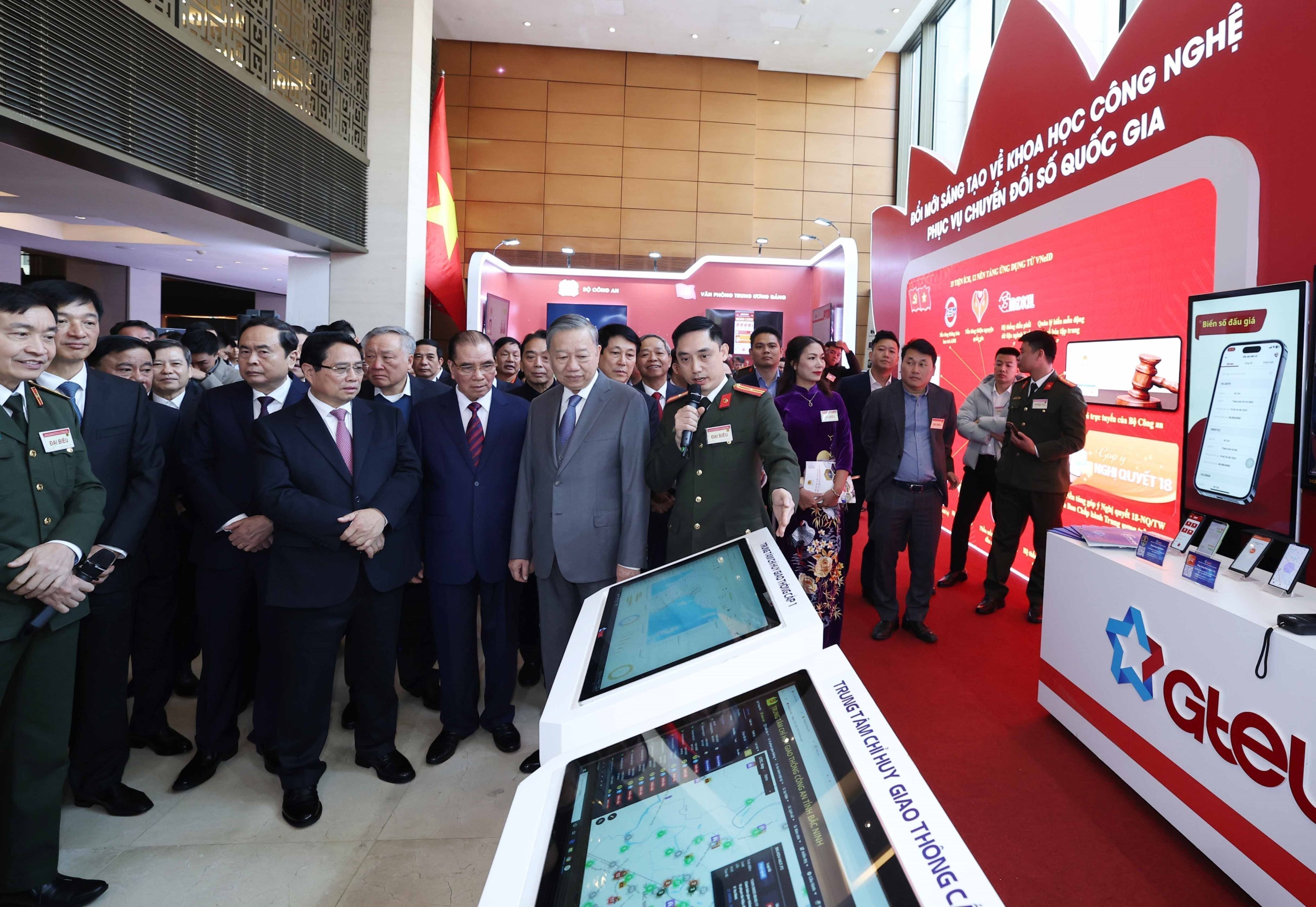 苏林总书记以及党和国家领导、前国家领导参观科技突破、创新和国家数字化转型全国会议的展示区。