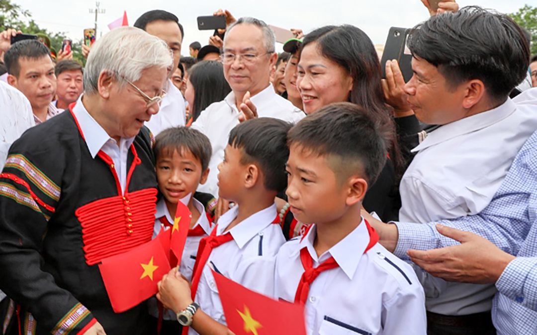 Tổng Bí thư Nguyễn Phú Trọng với đồng bào dân tộc và thiếu nhi các Buôn , thôn xã Dur Kmăl, huyện Krông Ana. Ảnh: TTXVN