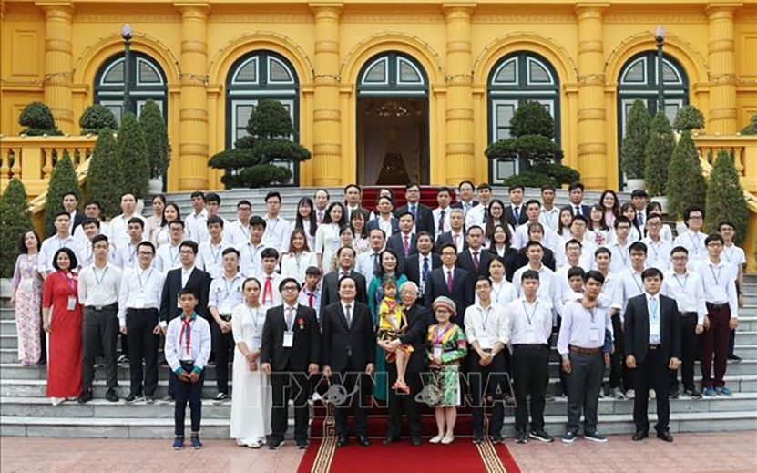Tổng Bí thư, Nguyễn Phú Trọng và các đại biểu chụp ảnh chung với các em học sinh, sinh viên tiêu biểu, xuất sắc. Ảnh: TTXVN