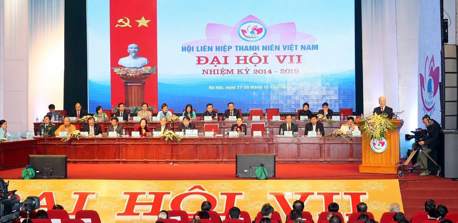 Tổng Bí thư Nguyễn Phú Trọng tham gia Đoàn Chủ tịch Đại hội đại biểu toàn quốc Hội Liên hiệp thanh niên Việt Nam lần thứ VII, nhiệm kỳ 2014 – 2019. Ảnh: TTXVN