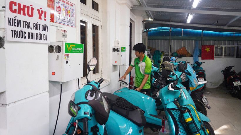 Mô hình kinh doanh, kết hợp sạc pin cho xe máy điện tại phường Tân Hưng, Thành phố Hồ Chí Minh. Ảnh: THẾ ANH