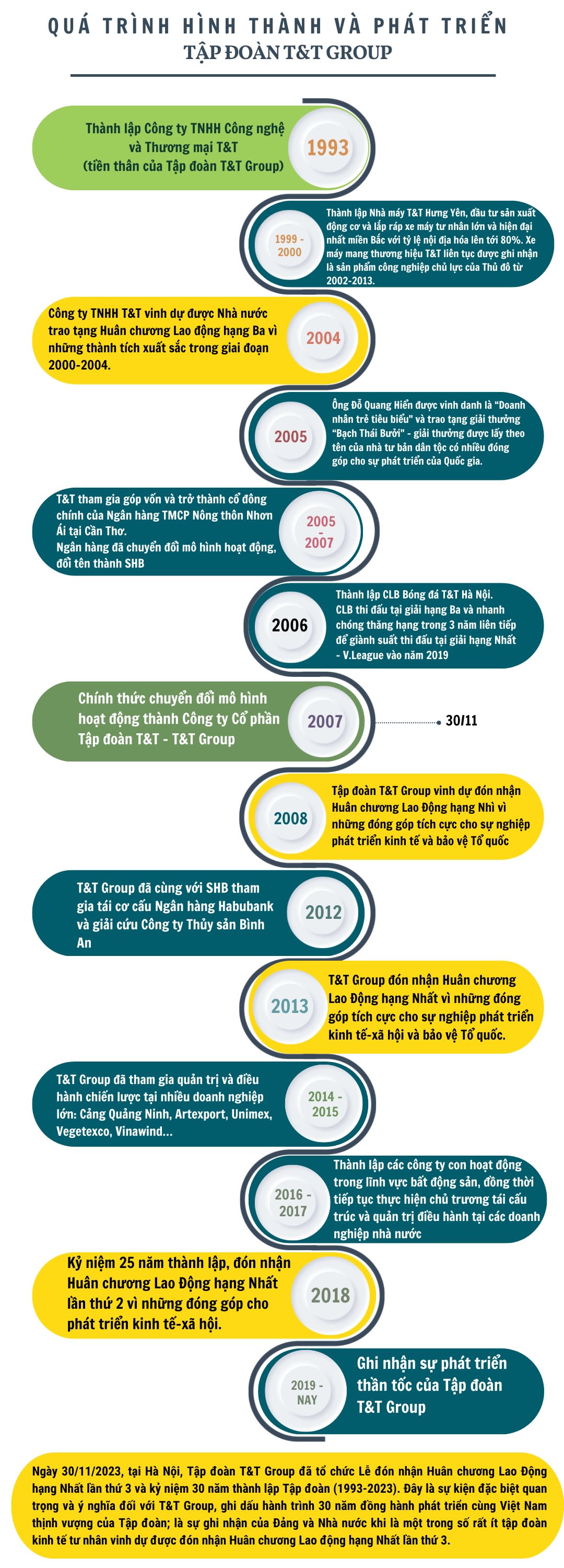 Được thành lập vào năm 1993, trải qua 30 năm hình thành và phát triển, T&T Group đã vươn mình trở thành một trong những tập đoàn kinh tế tư nhân đa ngành hàng đầu Việt Nam. Vốn điều lệ của T&T Group hiện đạt 22.000 tỷ đồng, tổng tài sản đạt 45.000 tỷ đồng.