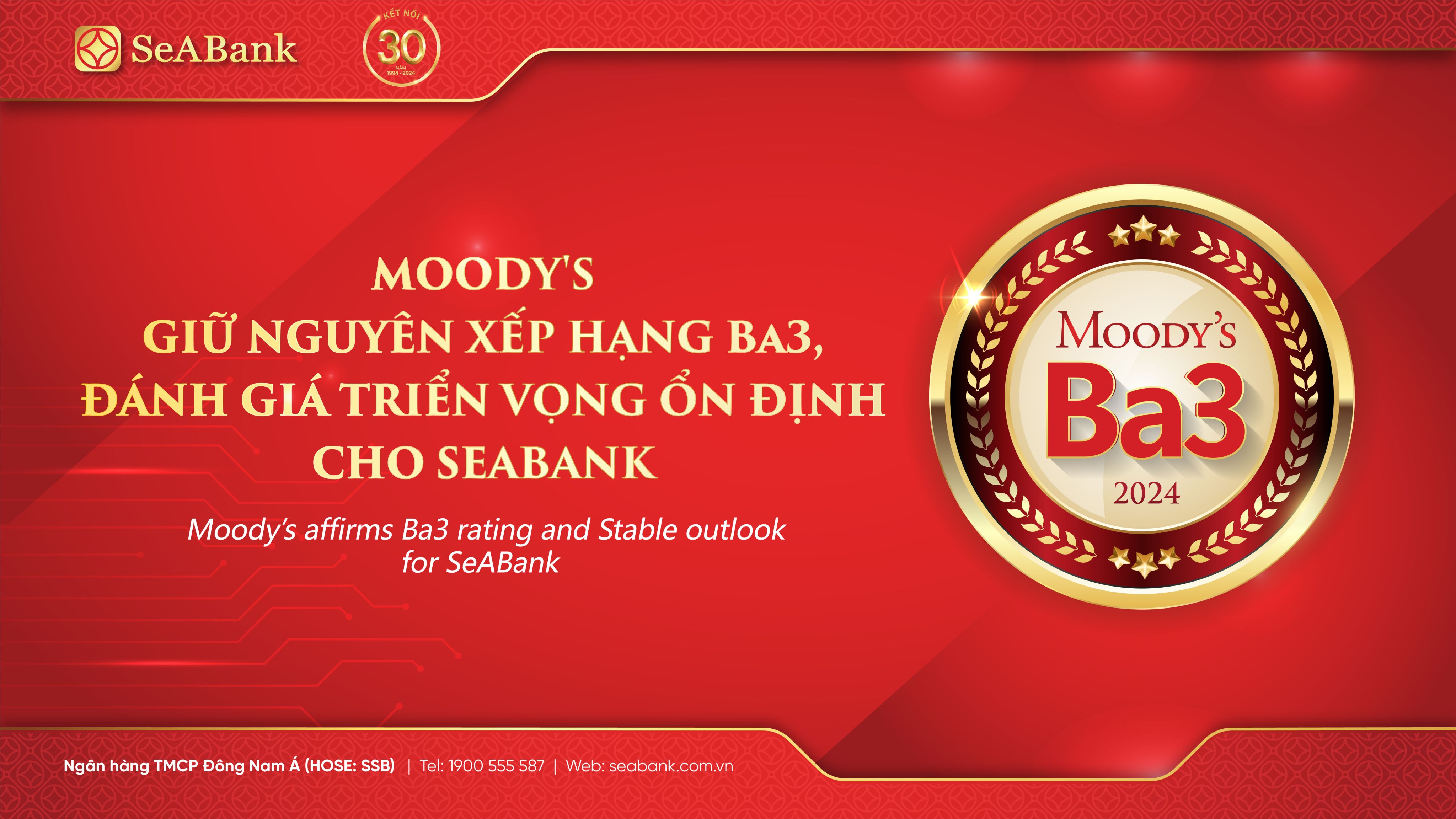 Moody's giữ nguyên xếp hạng tín nhiệm của SeABank ở mức Ba3 và triển vọng Ổn định