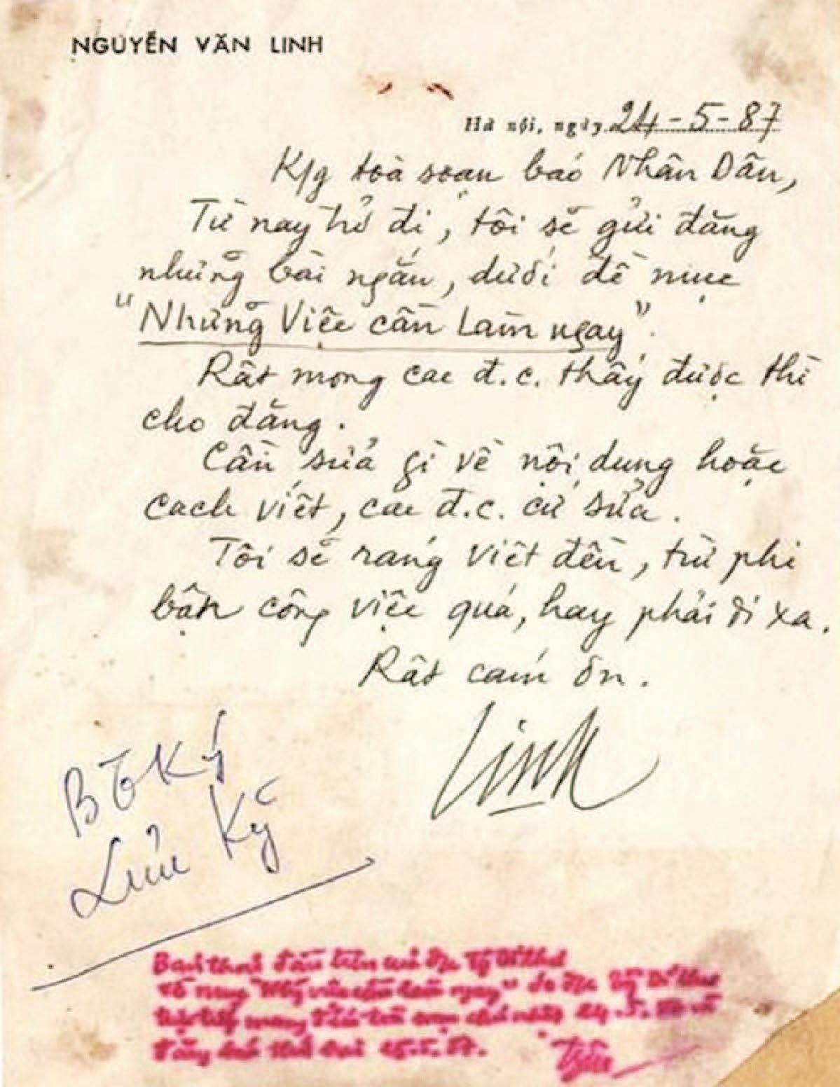 Thư của Tổng Bí thư Nguyễn Văn Linh gửi Ban Biên tập Báo Nhân Dân về loạt bài "Những việc cần làm ngay".