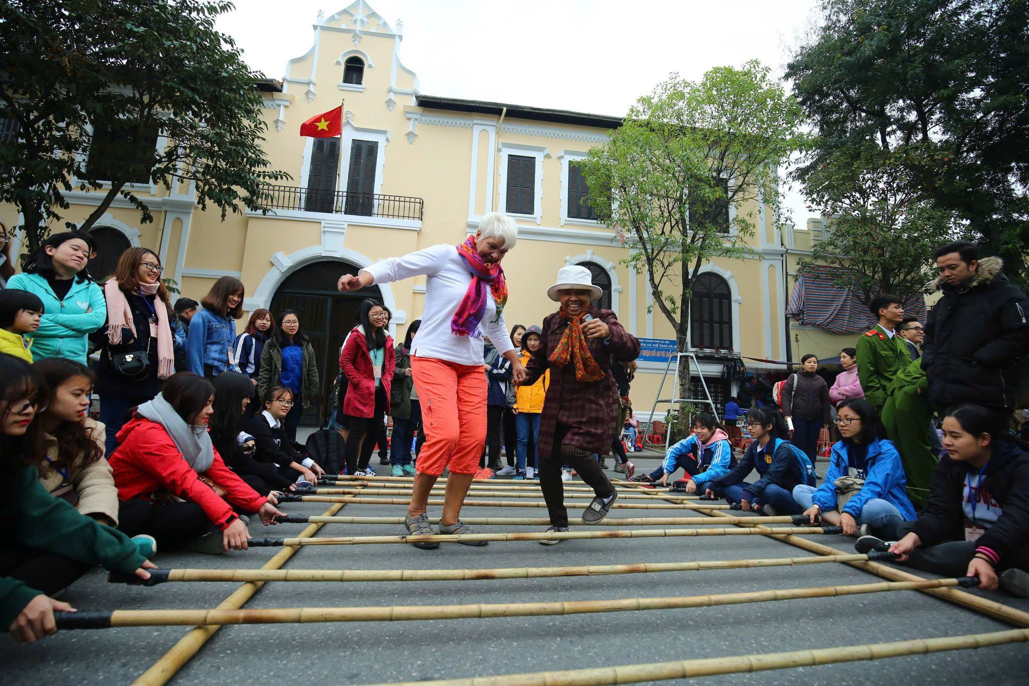 Du khách nước ngoài trải nghiệp điệu nhảy sạp.