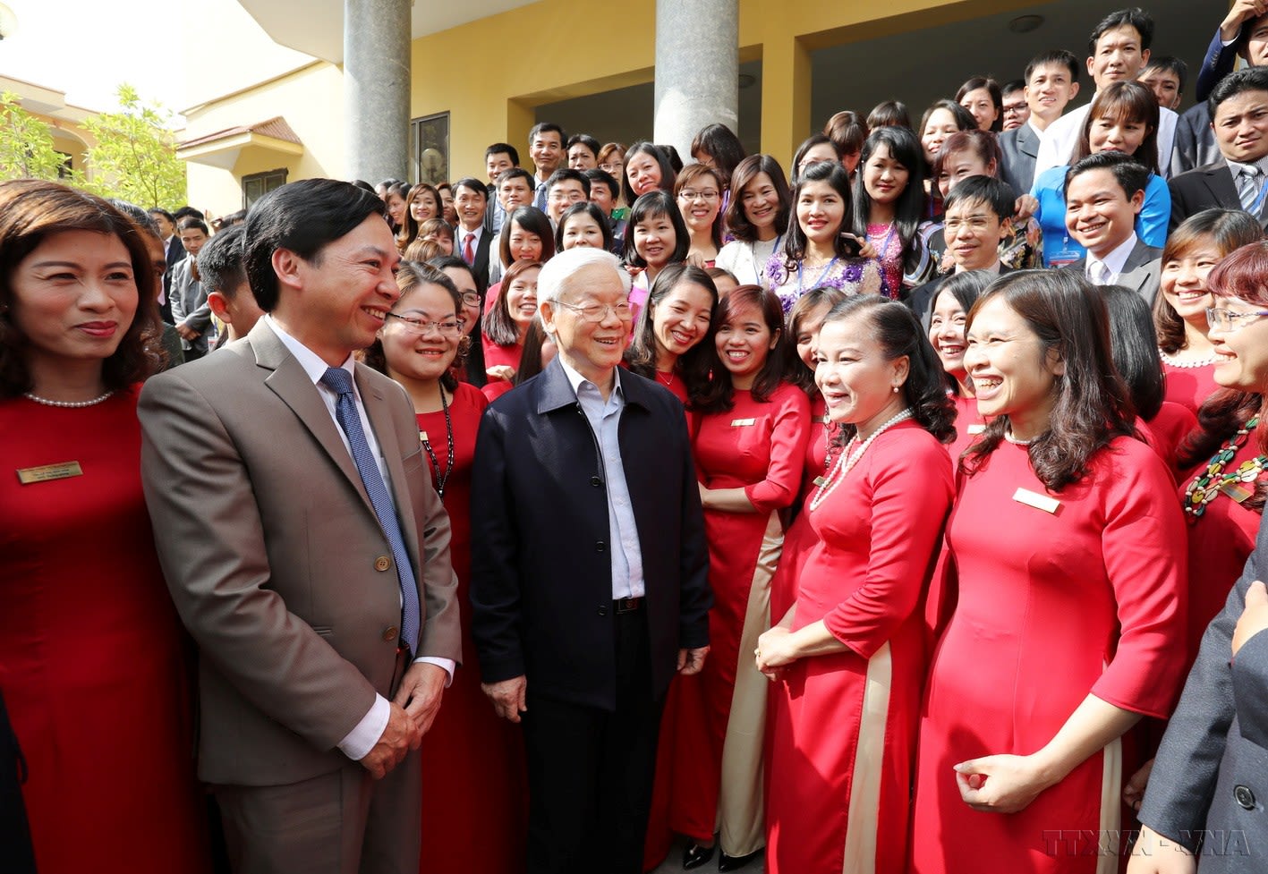 Tổng Bí thư Nguyễn Phú Trọng với các cán bộ, giảng viên và học viên Trường Chính trị Trường Chinh tỉnh Nam Định chiều 8/2/2017. Ảnh: TTXVN
