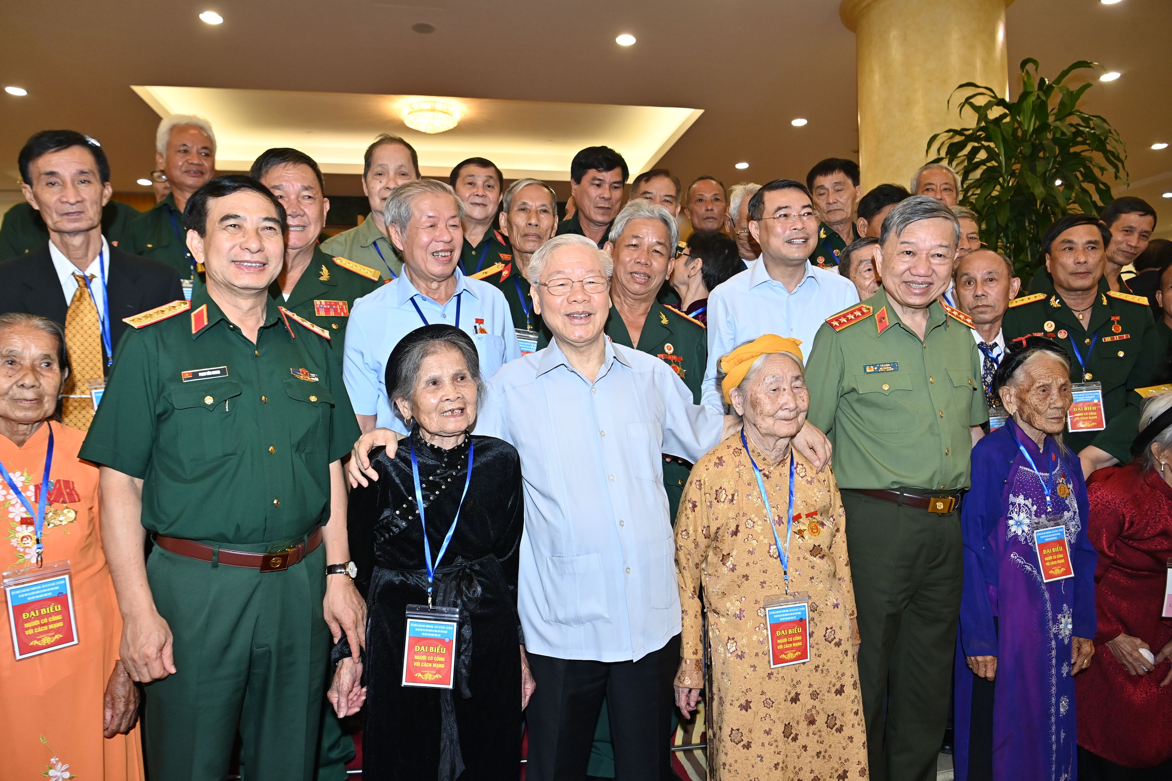 Tổng Bí thư Nguyễn Phú Trọng với các đại biểu tại buổi gặp mặt Đoàn đại biểu người có công với cách mạng tiêu biểu toàn quốc năm 2022. Ảnh: ĐĂNG KHOA