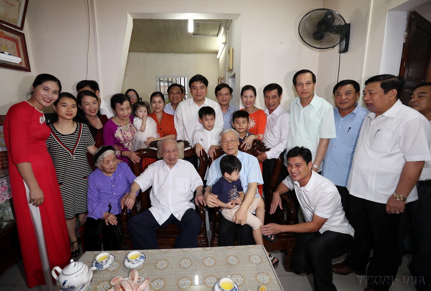 Tổng Bí thư Nguyễn Phú Trọng đến thăm và tặng quà ông Lê Đăng Đương, lão thành Cách mạng ở phường Hưng Dũng, thành phố Vinh chiều 29/10/2017. Ảnh: TTXVN