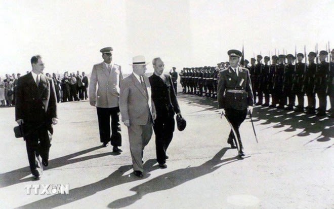 Chủ tịch Đoàn Chủ tịch Xô viết Tối cao Liên Xô Kliment Voroshilov chủ trì Lễ đón Chủ tịch Hồ Chí Minh thăm hữu nghị chính thức Liên Xô, tại sân bay Moskva, ngày 12/7/1955. Ảnh: Tư liệu TTXVN