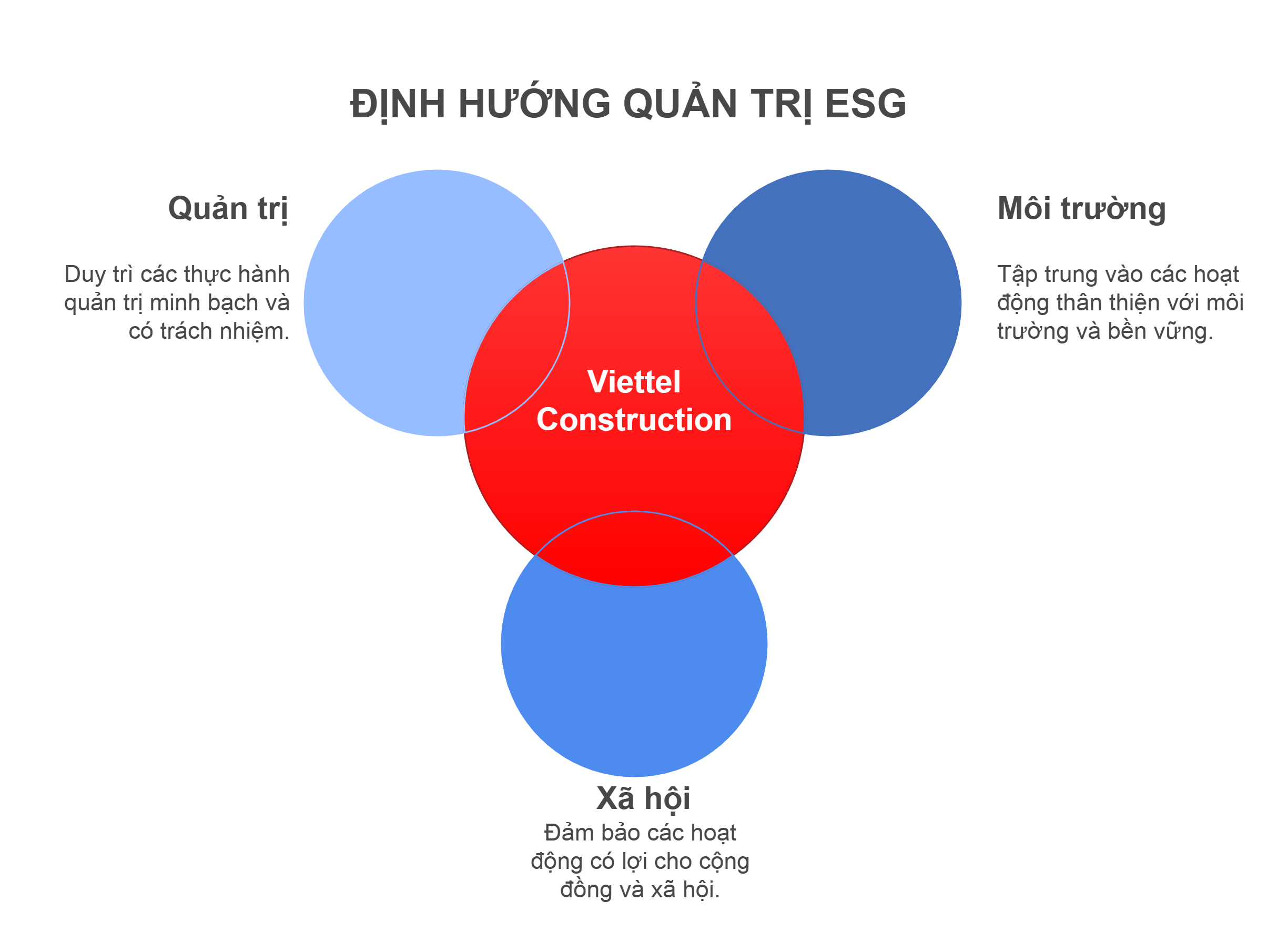 Các tiêu chuẩn về doanh thu, lợi nhuận, lợi ích cổ đông hay các con số tài chính sẽ không còn là thước đo duy nhất của Viettel Construction. Tổng Công ty đã hướng đến mở rộng các tiêu chí thích ứng, chống chịu và phục hồi trước những thách thức chưa có trong tiền lệ. Nhằm tích hợp các giá trị, mục tiêu và chỉ số kinh doanh để giảm thiểu rủi ro, đồng thời nắm bắt những cơ hội liên quan. Viettel Construction định hướng quản trị hiệu quả theo ESG (Environmental – Social – Governance). Việc cân bằng kiềng 3 chân “môi trường – xã hội – quản trị” sẽ giúp cho Viettel Construction đóng góp vào sự phát triển bền vững của xã hội. Và ngược lại, môi trường xã hội tốt sẽ là cơ hội để các doanh nghiệp như Viettel Construction tiến đến phát triển bền vững.