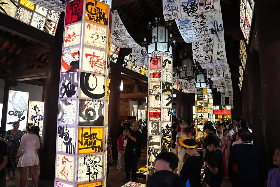 今年9月,在文庙-国子监遗迹区举办的“笔砚留香”展览吸引众多公众的关注,因为这是首次一场书法展览超越了使用中国墨和毛笔写字的规则,越南国语字的书法以富有艺术性的书画作品为资格出现。关于这次展览,偶舒(阮青松)书法家分享:“书法家必须挖掘每个字符独特之美,然后将其组合成一部犹如交响乐旋律的作品。在‘笔砚留香’展览,除了开发每个字母的单纯性以外,书法家还通过光线和色彩效果使其更加闪闪发光。由此,字母不再是简单的线条,而成为非传统的书法作品,给观众带来许多不同的感触。人们可以看到充满传奇色彩的升龙、雾气缭绕或秋风徐徐且浪漫的河内等等”。该展览正是书法家对文化工业发展事业的“宣言”。