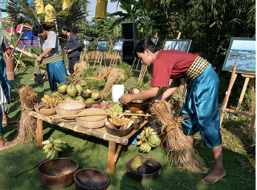 Dưới cổng, người dân Khmer đặt một chiếc bàn, rồi bày các vật cúng gồm: nhang đèn, cốm dẹp và các hoa màu nông sản khác như dừa tươi, chuối, khoai lang, khoai mì, khoai môn đã luộc chín hoặc chế biến thành chè…