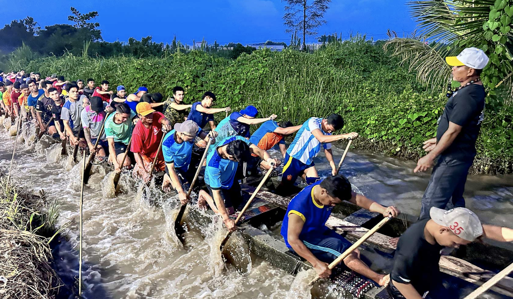 Đội ghe ngo chùa Cham Pa, xã Phú Tân, huyện Châu Thành tập trung tập luyện. (Ảnh: Cổng thông tin điện tử huyện Châu Thành)