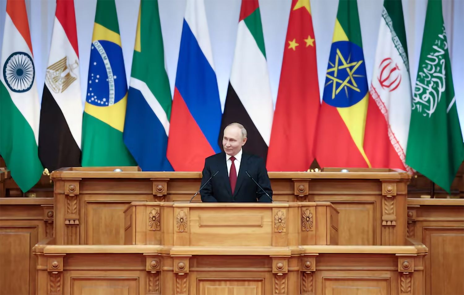 俄罗斯总统弗拉基米尔·普京于2024年7月11日在俄罗斯圣彼得堡举行的金砖国家议会论坛上发表讲话。(图片来源:路透社)