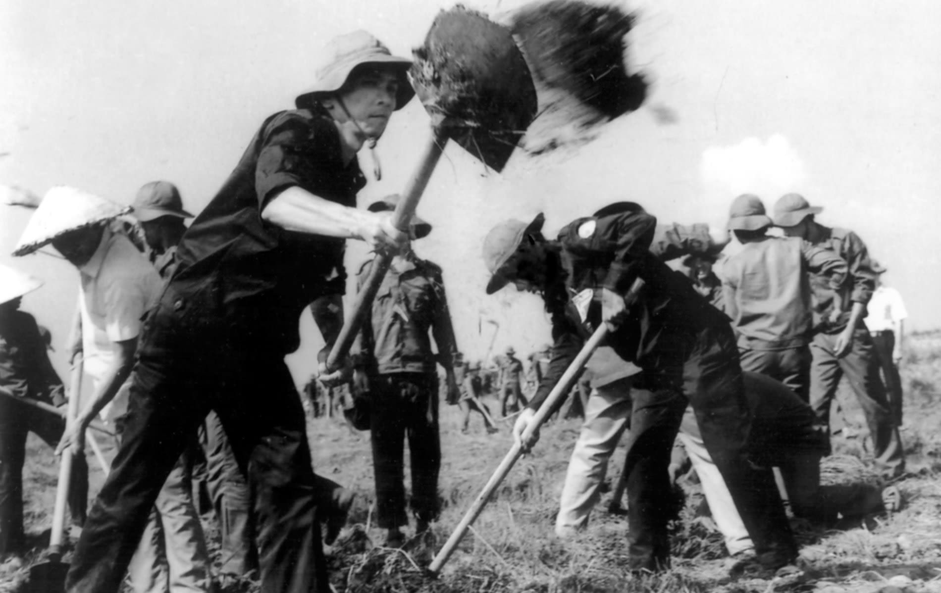 Đồng chí Võ Văn Kiệt, Chủ tịch UBND Thành phố Hồ Chí Minh cùng lao động với các đội viên thanh niên xung phong ngày thành lập Lực lượng thanh niên xung phong miền nam xây dựng vùng kinh tế mới, ngày 29/3/1976. Ảnh: baotangtuoitre.vn