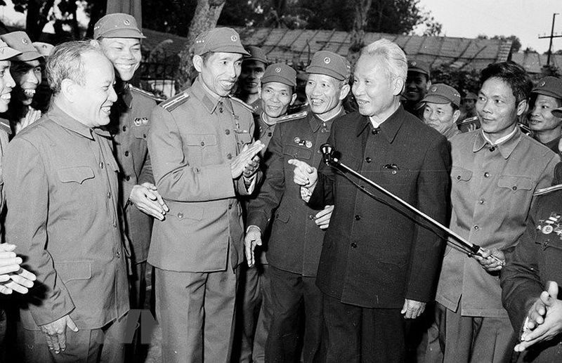 Tổng Bí thư Lê Duẩn thăm cán bộ, chiến sĩ Tiểu đoàn tên lửa 77 (Trung đoàn 257, Sư đoàn 361, Quân chủng Phòng không-Không quân), tháng 1/1980. Ảnh: TTXVN
