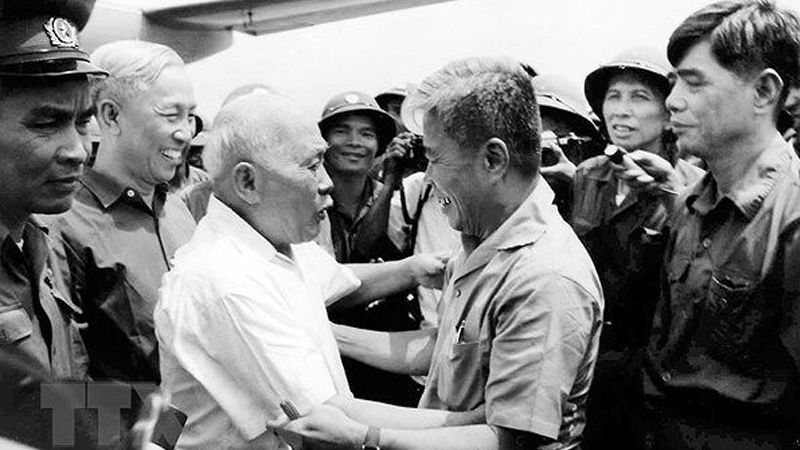 Các vị lãnh đạo Trung ương Cục và quân dân miền Nam đón Chủ tịch Tôn Đức Thắng vào dự Lễ mừng chiến thắng tại thành phố Sài Gòn, ngày 13/5/1975. (Ảnh: TTXVN)