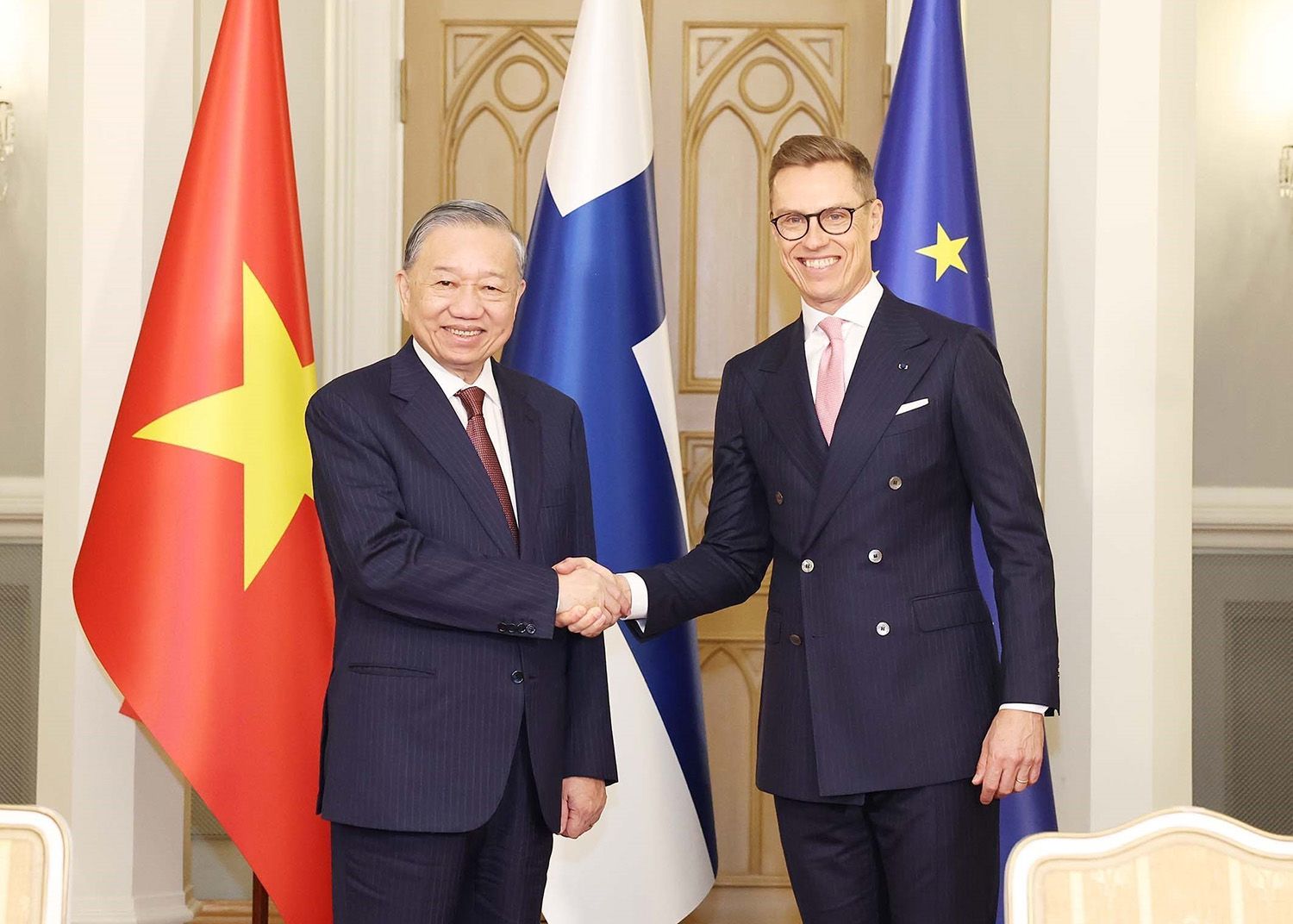 El secretario general del PCV, To Lam, y el presidente de Finlandia, Alexander Stubb, se informaron sobre el desarrollo de sus respectivos países y expresaron su satisfacción por el florecimiento de los vínculos binacionales. Abordaron grandes proyecciones estratégicas para dinamizar esos nexos, colocándolos a la altura de su actual envergadura. Entre las áreas aprobadas para más interacciones destacan la economía circular, la transición verde, la cooperación marítima sostenible, la transformación digital, el medio ambiente y el enfrentamiento al cambio climático.