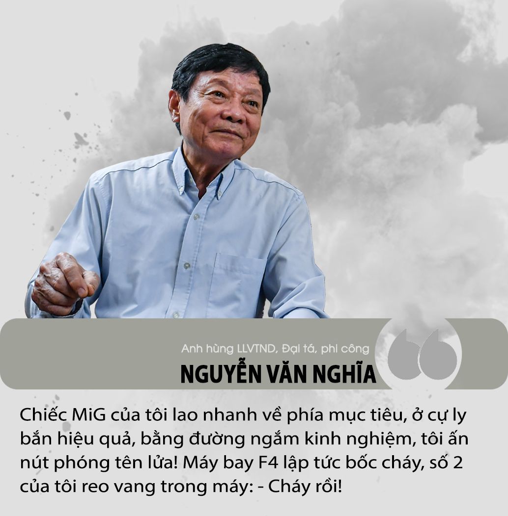 “Chiếc MiG của tôi lao nhanh về phía mục tiêu, ở cự ly bắn hiệu quả, bằng đường ngắm kinh nghiệm, tôi ấn nút phóng tên lửa! Máy bay F4 "Con ma" lập tức bốc cháy, số 2 của tôi reo vang trong máy: "Cháy rồi!”, gương mặt ông rạng rỡ khi nhớ lại khoảnh khắc này.