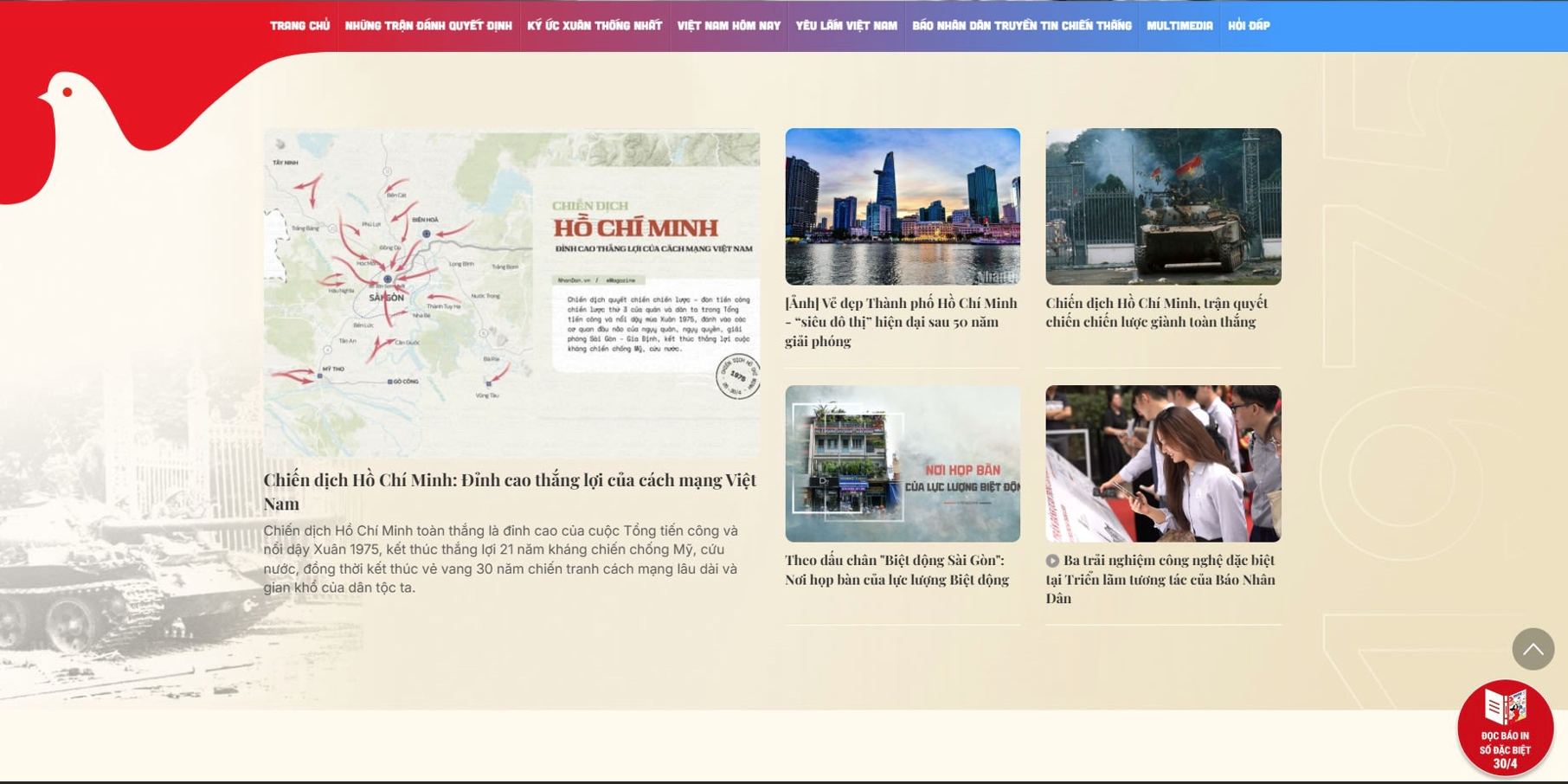Trong không khí đồng bào cả nước đang hướng về ngày lễ trọng đại, đánh dấu thời khắc lịch sử mở ra kỷ nguyên độc lập dân tộc và chủ nghĩa xã hội, khi non sông được thu về một mối cách đây tròn nửa thế kỷ, Báo Nhân Dân đã giới thiệu đợt thông tin đặc biệt và Triển lãm tương tác kỷ niệm 50 năm ngày Giải phóng miền Nam, Thống nhất đất nước (30/4/1975-30/4/2025).