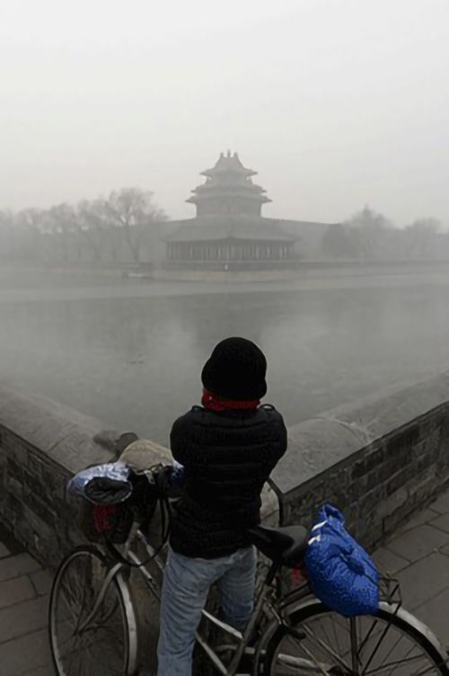Một người dân chụp lại hình ảnh Cố Cung-Tử Cấm Thành chìm trong khói bụi, ngày 25/12/2015. (Ảnh: Tân Hoa Xã)