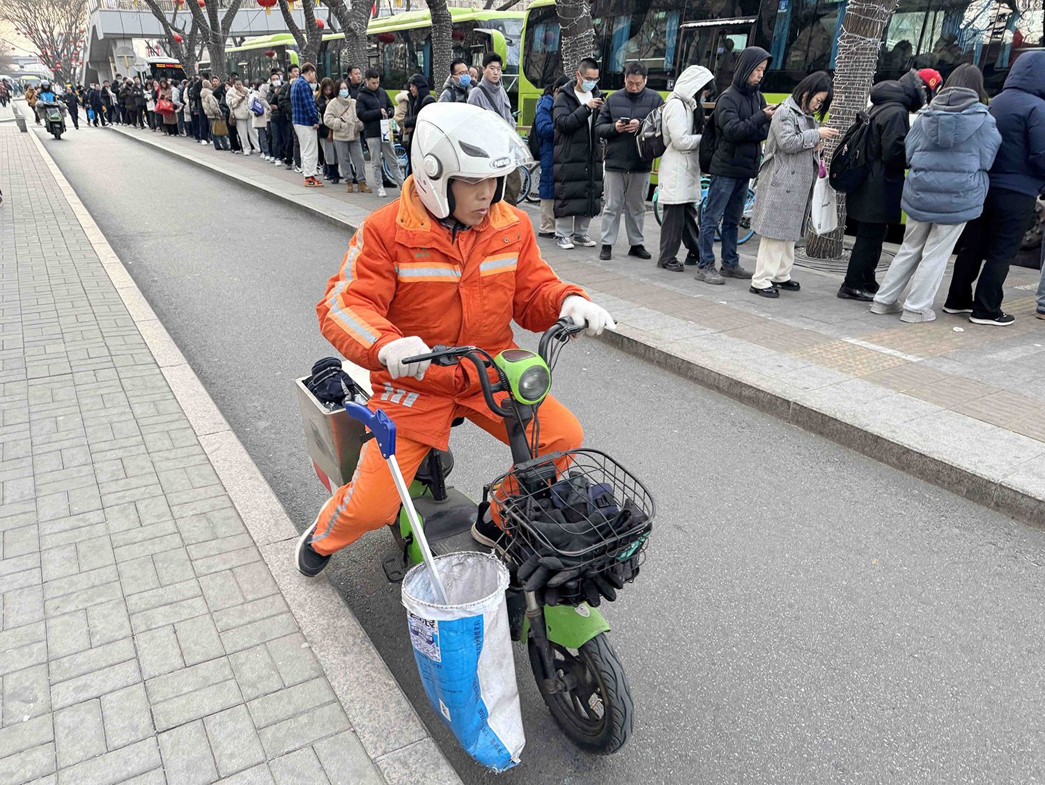 Nhân viên môi trường tại Bắc Kinh thu gom các loại rác thải trên đường nhằm bảo đảm đường phố luôn sạch sẽ. (Ảnh: TTXVN)